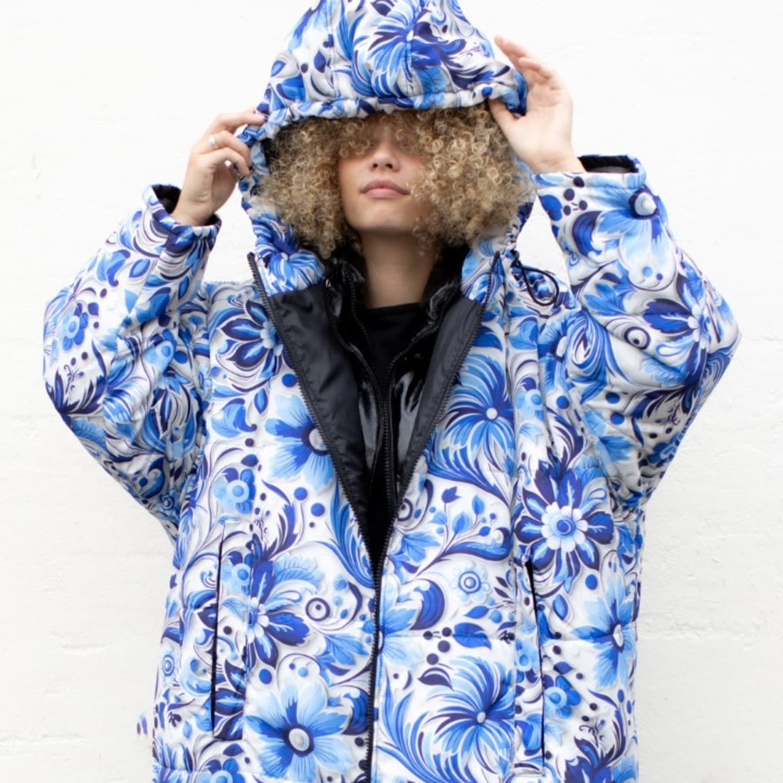 Blue floral print coat. Windproof, water-repellent, and breathable for ultimate comfort. Practical side openings for...