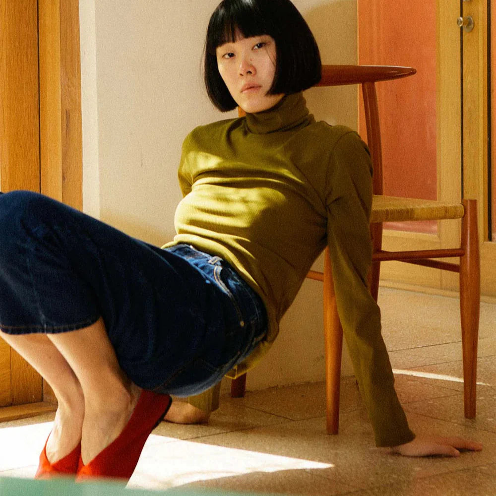 Fitted ribbed roll neck top, crafted from an organic cotton tencel blend. Cut to a...