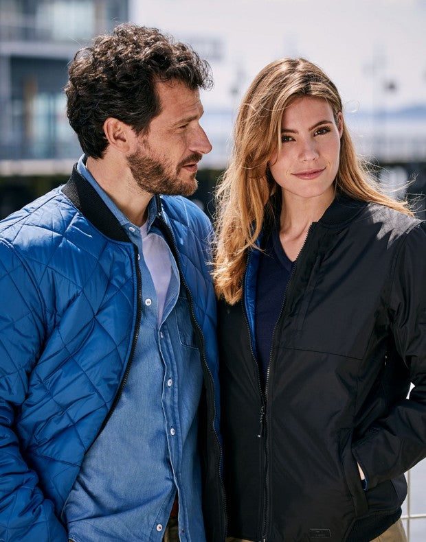 Cutter & Buck Fairchild Ladies Padded Bomber Jacket | Reversible Black to Quilted Blue | XS-2XL