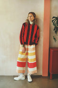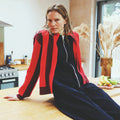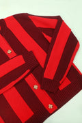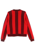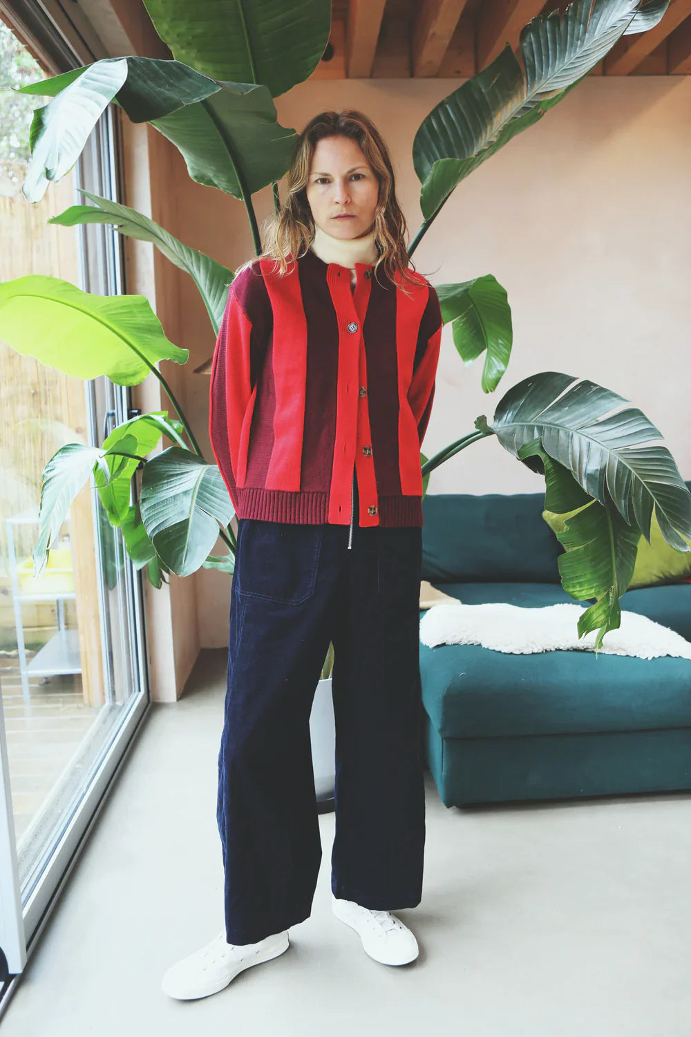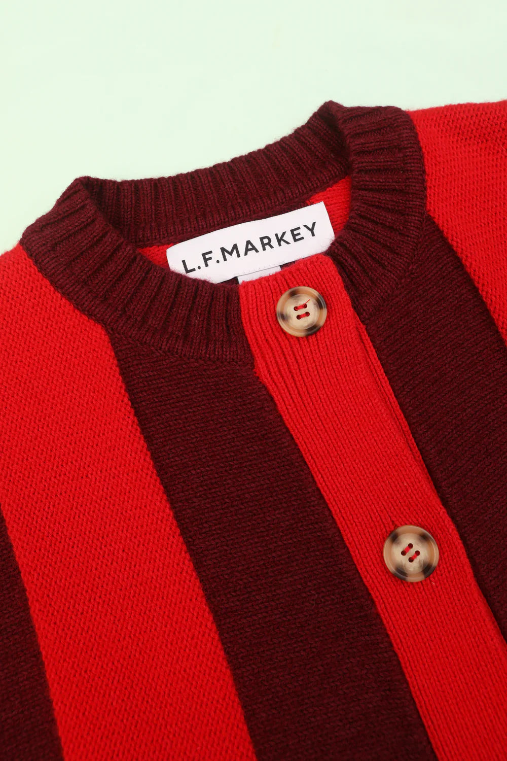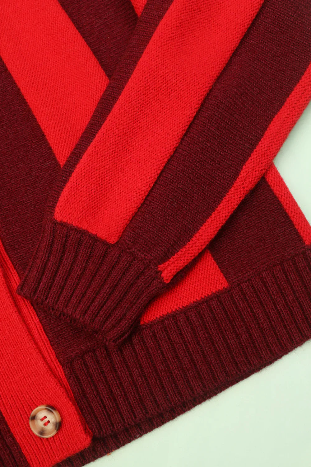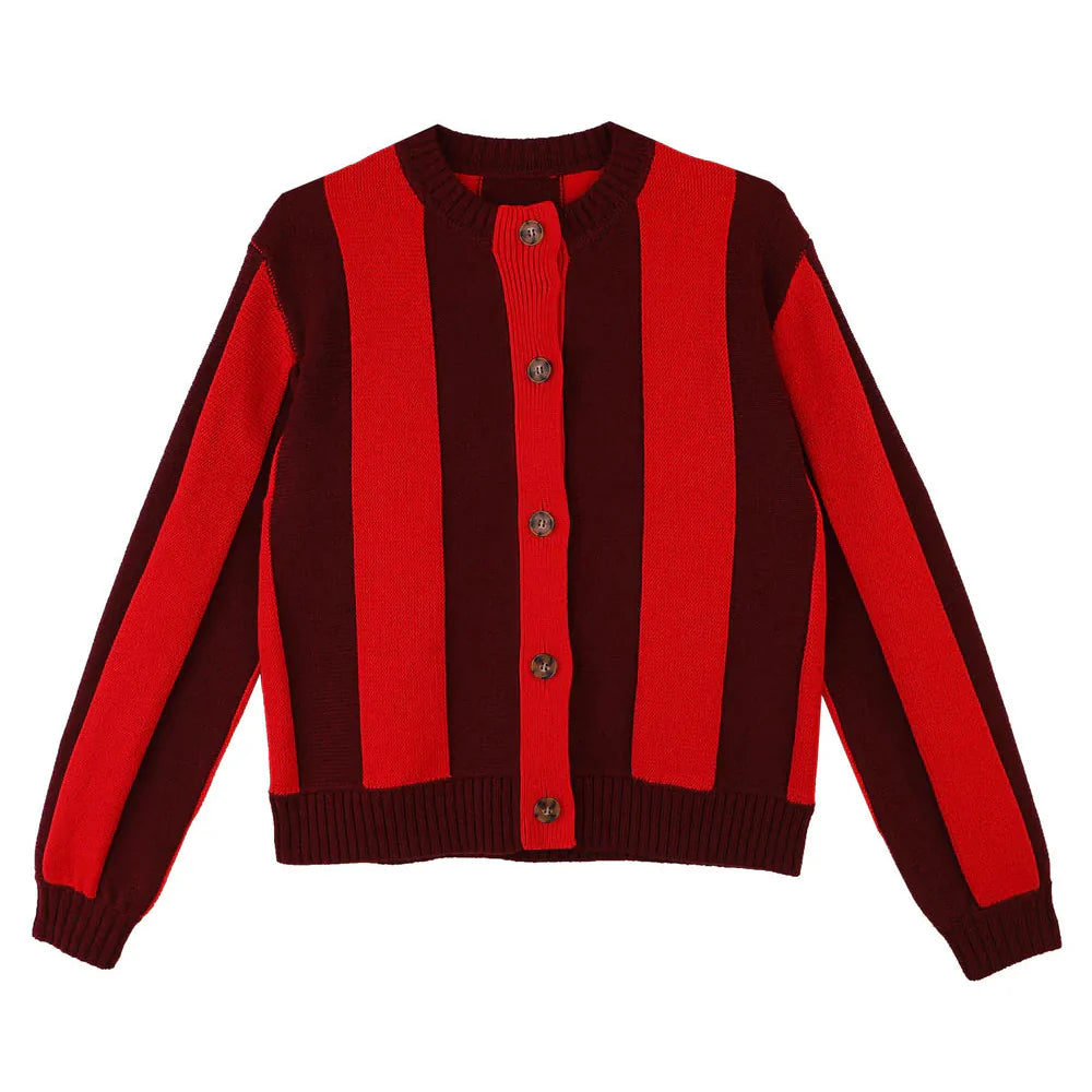The Ace Cardigan is a straight cut, close-fitting chunky cardigan. In a burgundy and red vertical stripe pattern inspired by heritage sportswear, it features chunky ribbing and imitation tortoiseshell buttons down the front. Model is 5'10" / 178 cm and is wearing a size S.