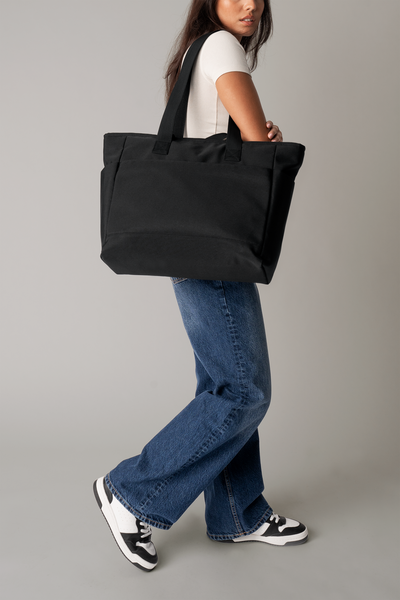 100% recycled | Zip pocket | Side pockets | Tonal zips | Water repellent | Hand or shoulder carry | 35x55x16.5cm