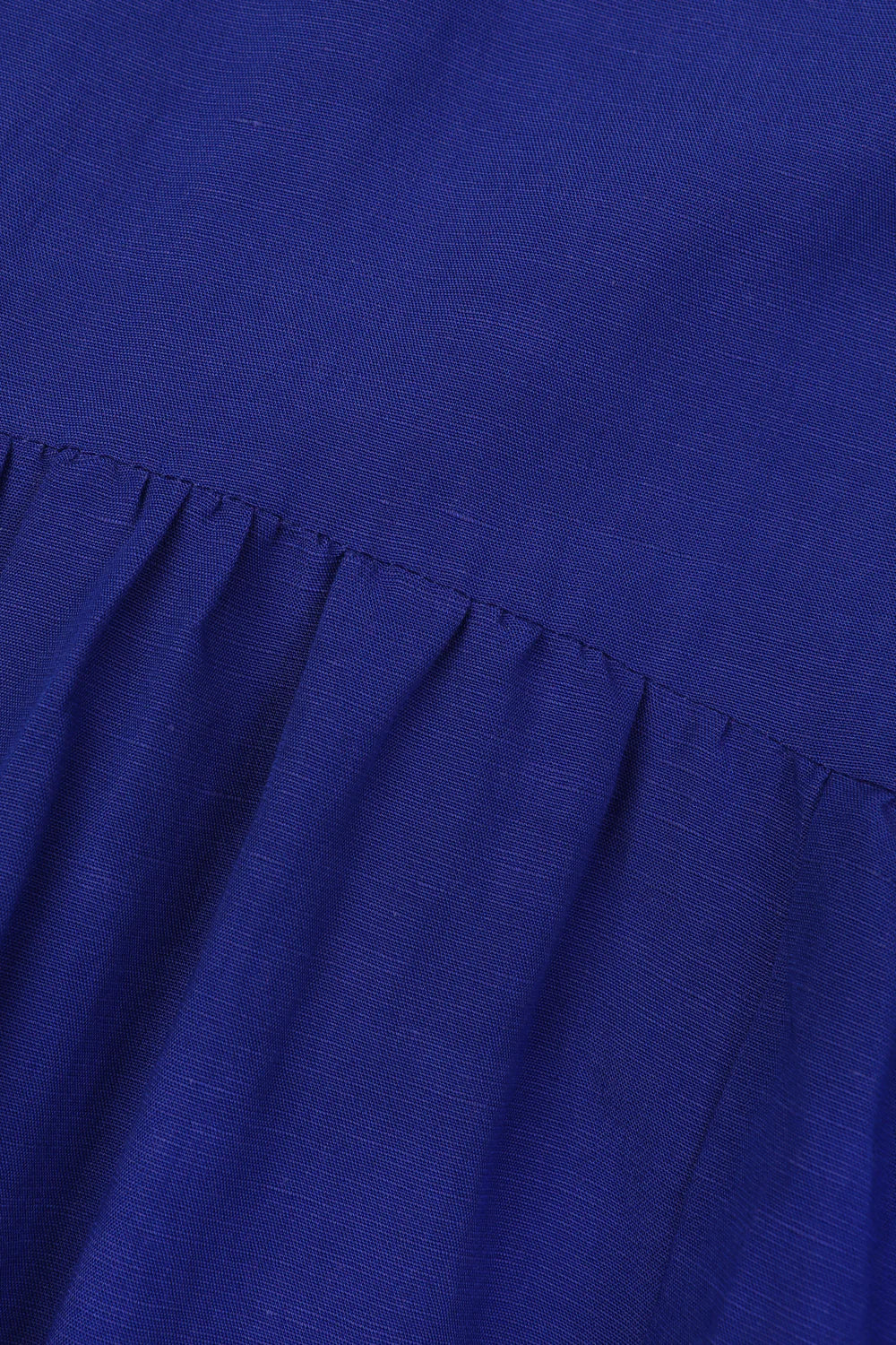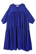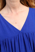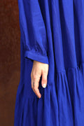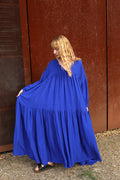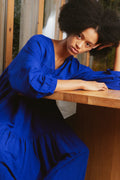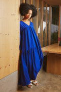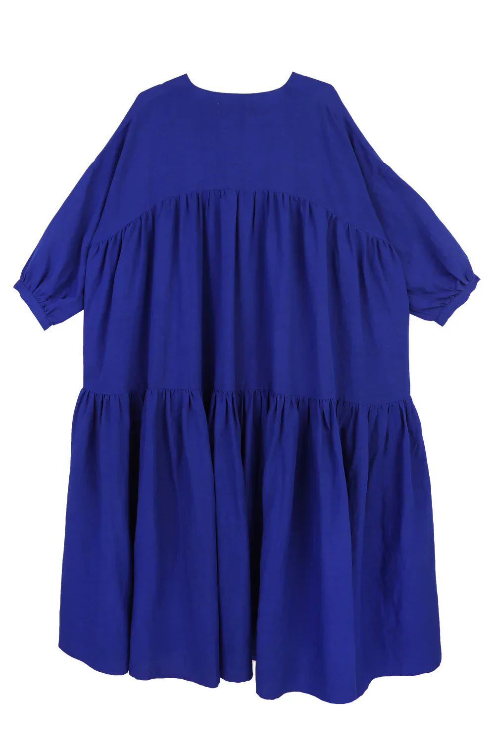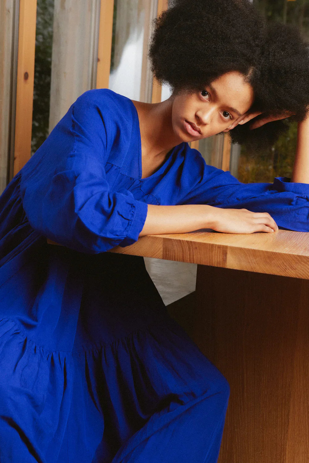 The Ballad Dress is a voluminous statement dress with a maxi-length silhouette. It has a V-neckline, gathered 3/4 length sleeves, side seam pockets and a sweeping gathered tiered hem which adds to the voluminous shape. Crafted from a textured linen viscose fabric in a vibrant shade or Ultramarine,