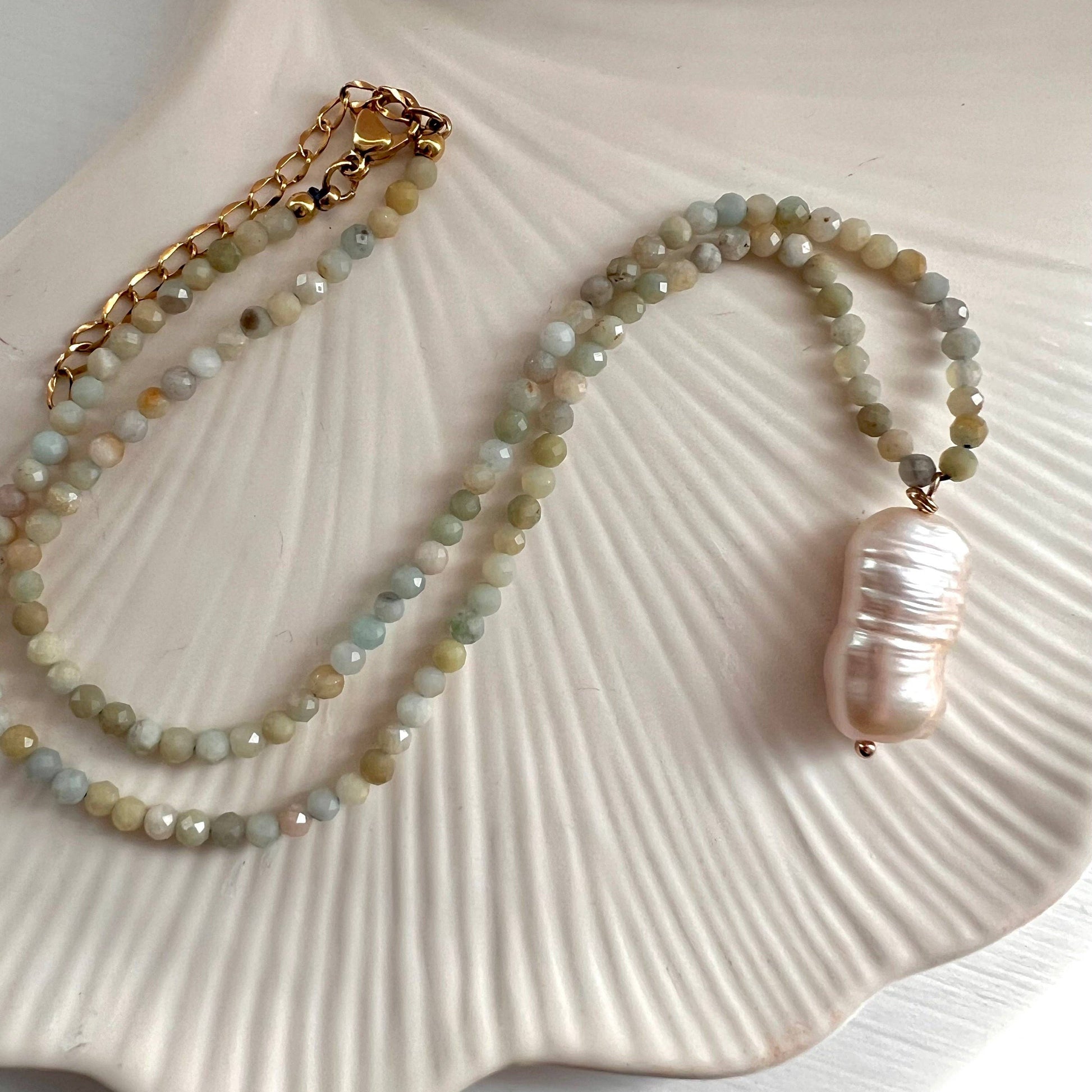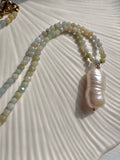 This stunning Baroque Pearl Beaded Necklace is the perfect accessory for your summer wardrobe. The beautiful Amazonite beads add a very subtle pop of colour and elegance to any outfit.