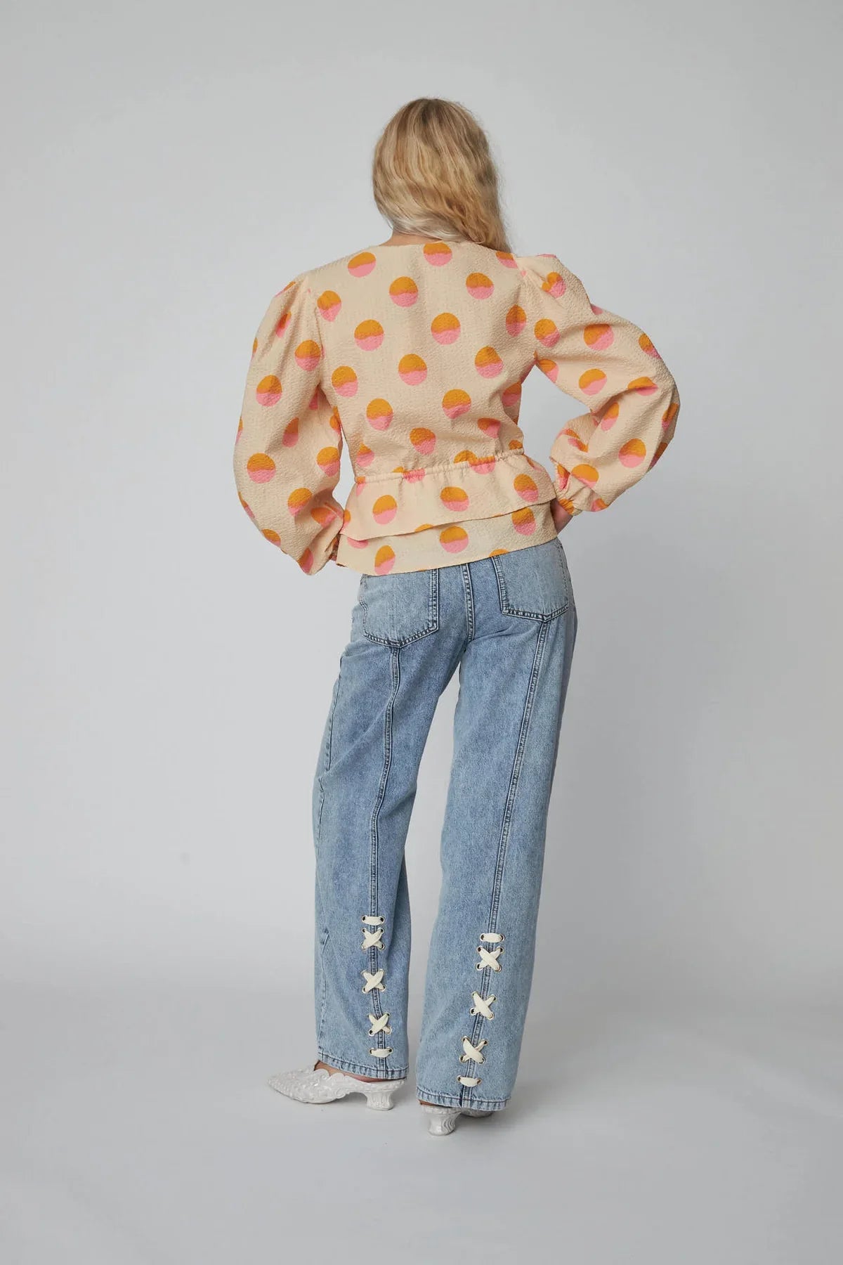 Blouse with textured fabric and V-neckline. The blouse features an adjustable drawstring at the waist for a tailored fit and a double ruffle detail at the hem.