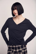 Long sleeve wrapped top with a surplice neckline and side pleats.