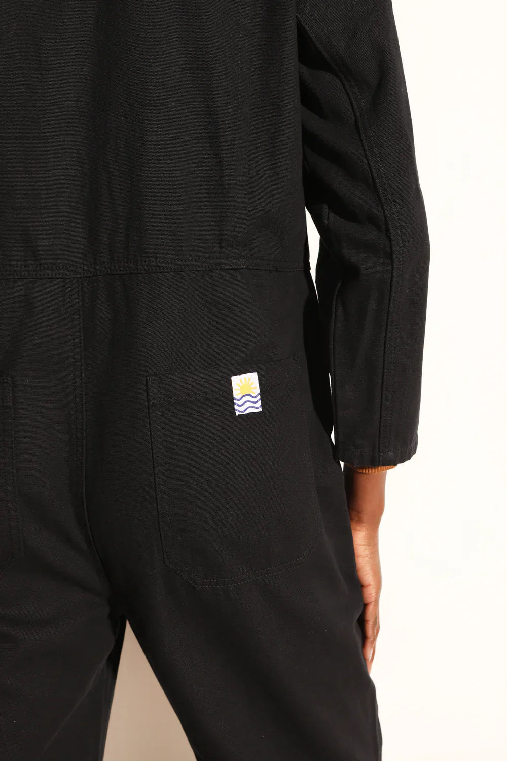 The Dominic Boilersuit has a relaxed fit and a slightly tapered leg, with 3/4 length sleeves. In a classic black non-stretch cotton canvas, with large utility style pockets and a silver front zip. Model is 5'11" / 181 cm and is wearing a size UK 8.