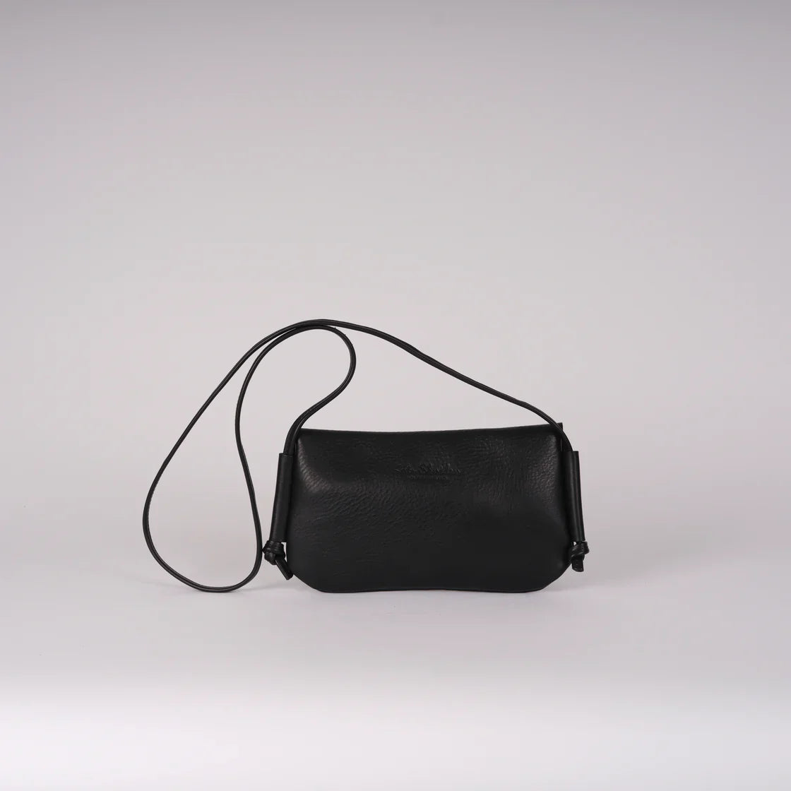 A folded leather strap threads through tubular loops at each side and ties in simple knots, giving the bag its distinctive, sculptural feel. Unlined and lightweight, it fastens with a hidden magnetic closure and is finished with silver-coloured Italian brass hardware.