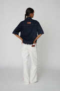 Short-sleeved denim shirt in soft denim with scalloped hem, button closure, and a chest pocket. The model is 177 cm tall and wearing a size EU 36