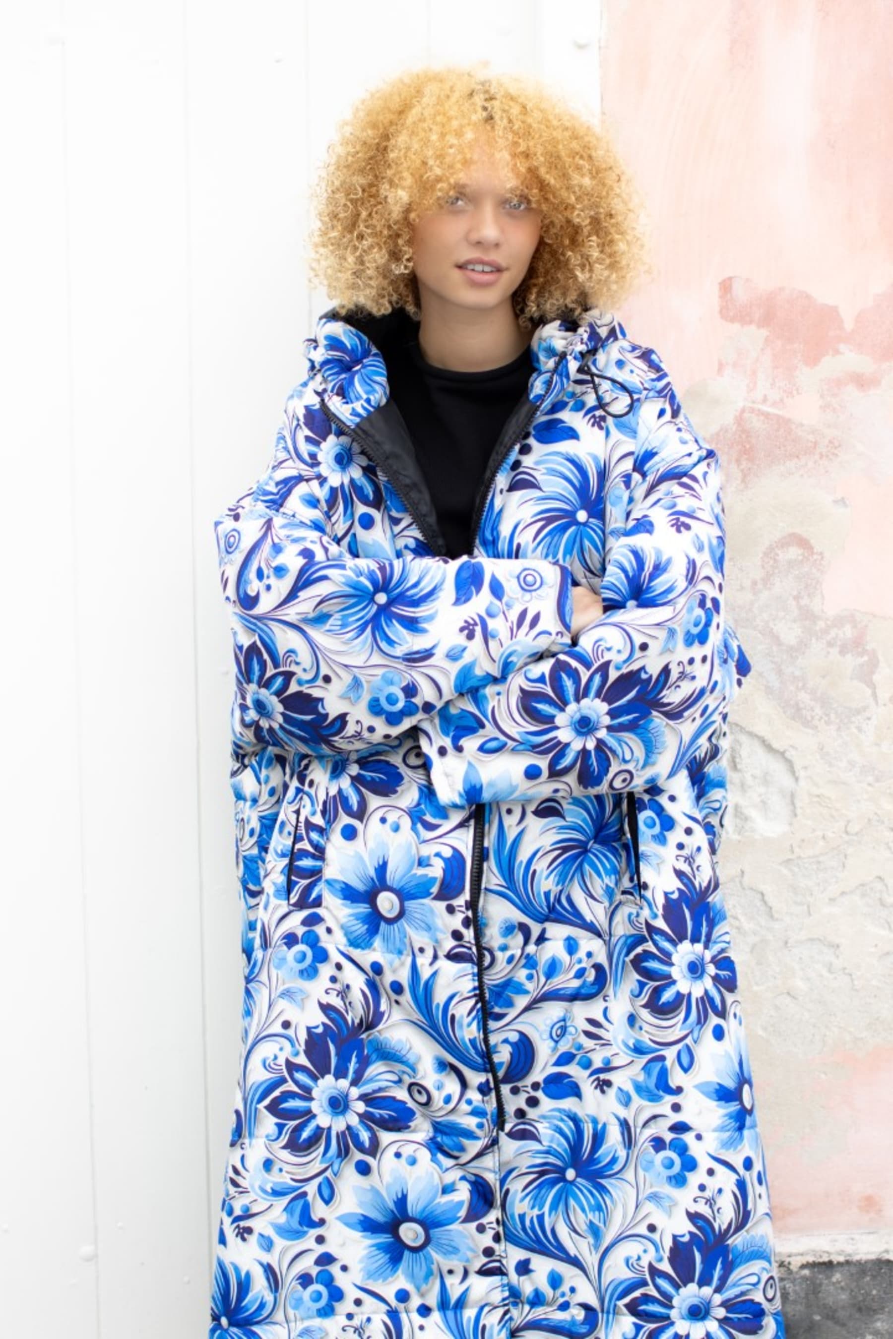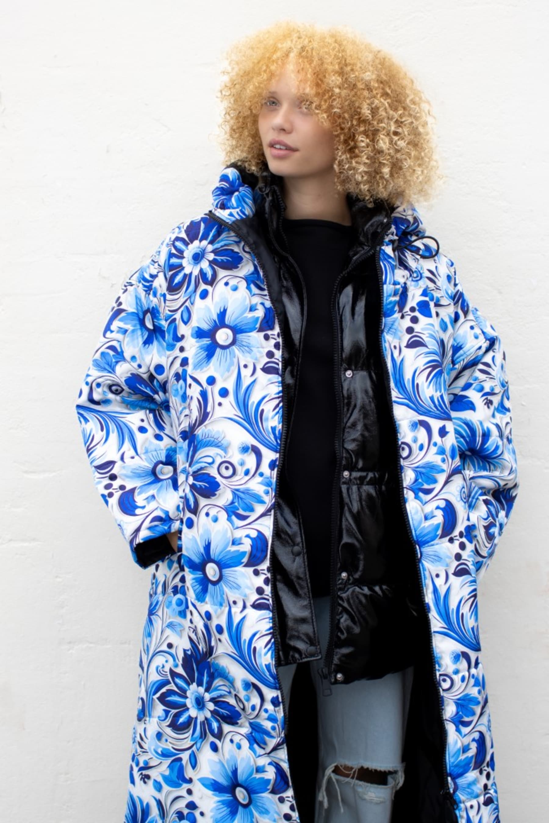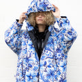 Blue floral print coat. Windproof, water-repellent, and breathable for ultimate comfort. Practical side openings for easy access to pockets and belongings. Unisex and one-size, designed to fit over any outfit.