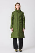 The slightly A-line silhouette features fully taped seams, a double-cursor waterproof front zipper, and waterproof side zippers with a contrasting under-placket and reflective print details.