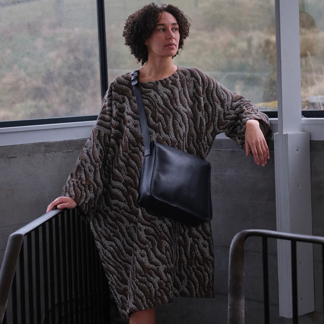 Edie dress with a winter makeover. Now with long sleeves and made in a beautiful French woven cloth. A simple and practical dress complete with large side pockets and fastened with a loop button closure.