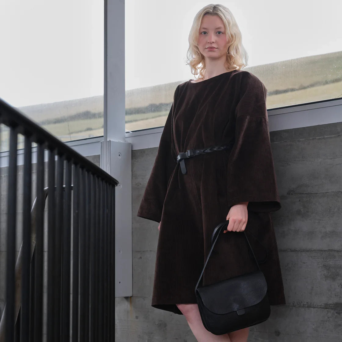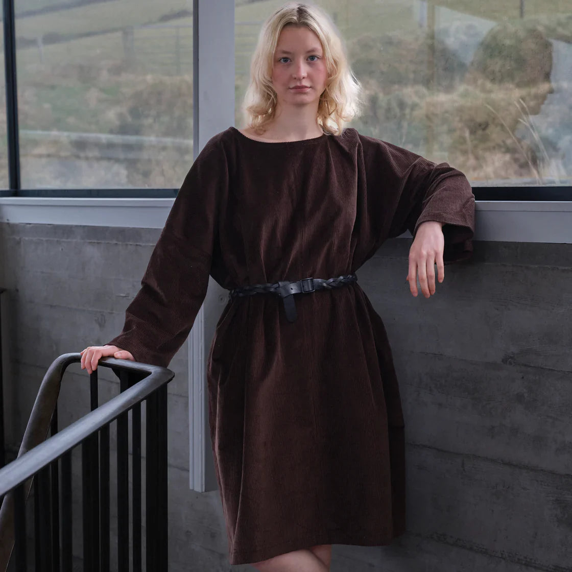 Edie dress with a winter makeover. Now with long sleeves and made in a luxurious cotton cord. A simple and practical dress complete with large side pockets and fastened with a loop button closure.