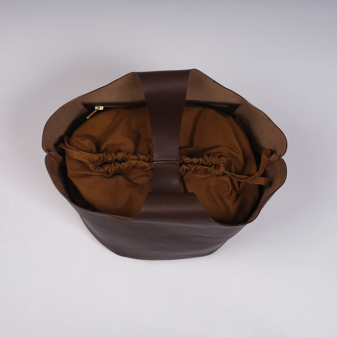 The Sling Bag is a stylish leather tote made in England from a tumbled vegetable tanned leather. It comes with a contrast wax cotton pouch insert to keep your valuables safe.