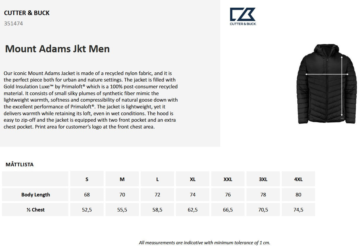 Cutter & Buck's iconic Mount Adams Jacket is made of 100% recycled nylon fabric, and it is the perfect piece both for urban and nature settings. The jacket is filled with Gold Insulation Luxe™ by Primaloft® which is a 100% post-consumer recycled material. It consists of small silky plumes of synthetic fiber which mimic the lightweight warmth, softness and compressibility of natural goose down with the excellent performance of Primaloft®. The jacket is lightweight, yet it delivers warmth while retaining its loft, even in wet conditions. The hood is easy to zip-off and the jacket is equipped with two front pocket and an extra chest pocket, all with quality YKK® zippers. The jacket is fully lined; the lining has an all-over emboss tile print.- Made from 100% recycled nylon