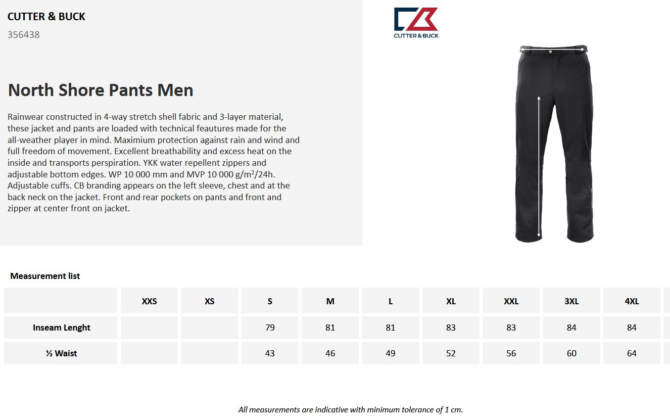 Loaded with technical features these versatile North Shore pants are ideal on the golf course or wearing out on a hike in rainy weather. The pants are constructed in the same 4-way stretch shell fabric as the North Shore jacket which is highly breathable and water proof. The elastic fabric gives you a great mobility and gentle comfort with every step. Front and rear pockets help you stash keys, phone, cards and belongings. Equipped with waterproof zippers at leg bottoms and zipped hand pockets. Other useful features include sealed seams and adjustable waist tabs. These trousers are made from Ventair® fabric, which represents the latest in cutting edge fabric technologies. It offers wind and water proofing in combination with excellent ventilation and moisture transport. Ventair® provides protection in chilly conditions with low bulk and a soft comfortable finish.- Versatile North Shore pants loaded with technical features