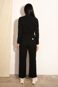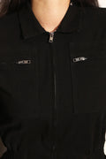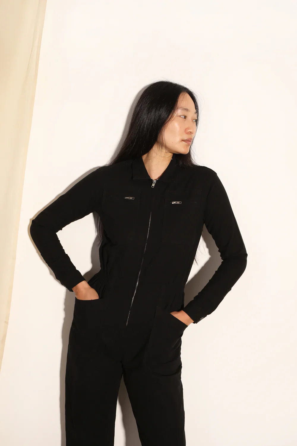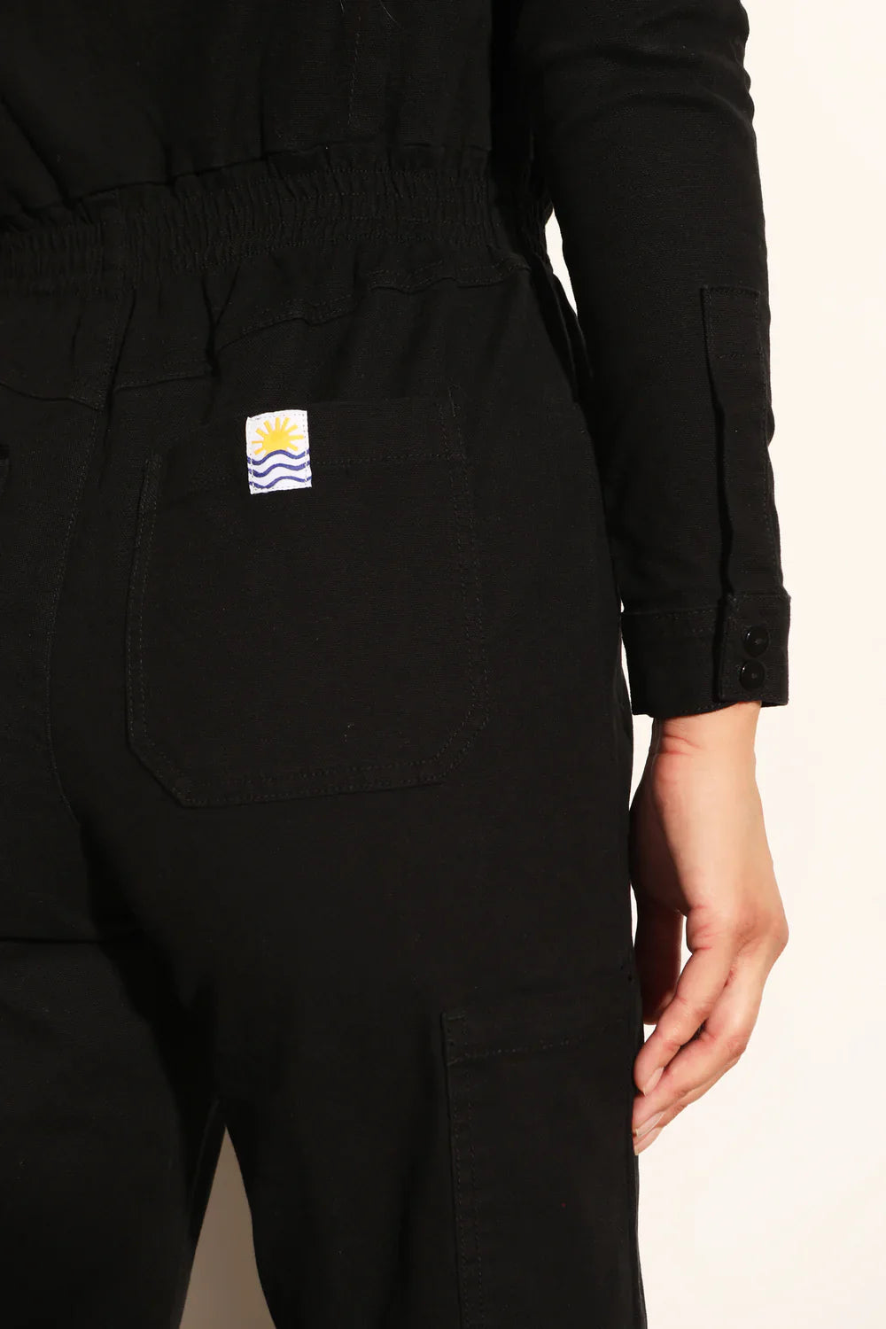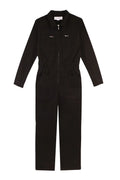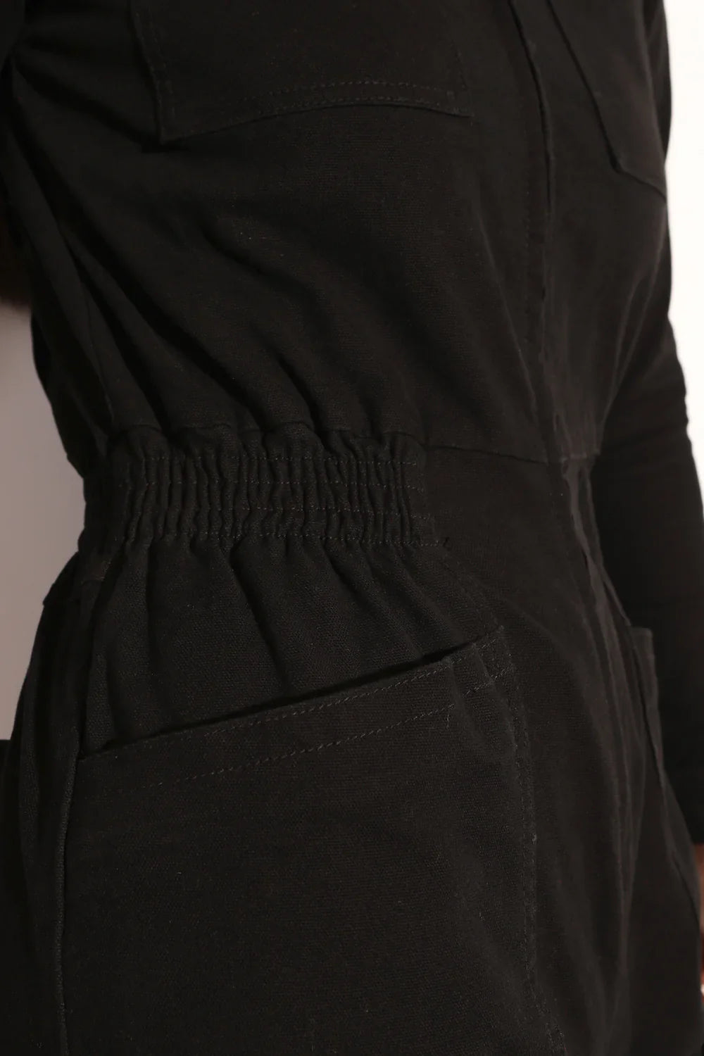 Black version of the classic fitted boiler suit. Elasticated at the waist with wide, straight legs. In heavy-weight cotton canvas with a small amount of stretch for a better fit. Model is 5'11" / 180 cm and is wearing a size UK 8.