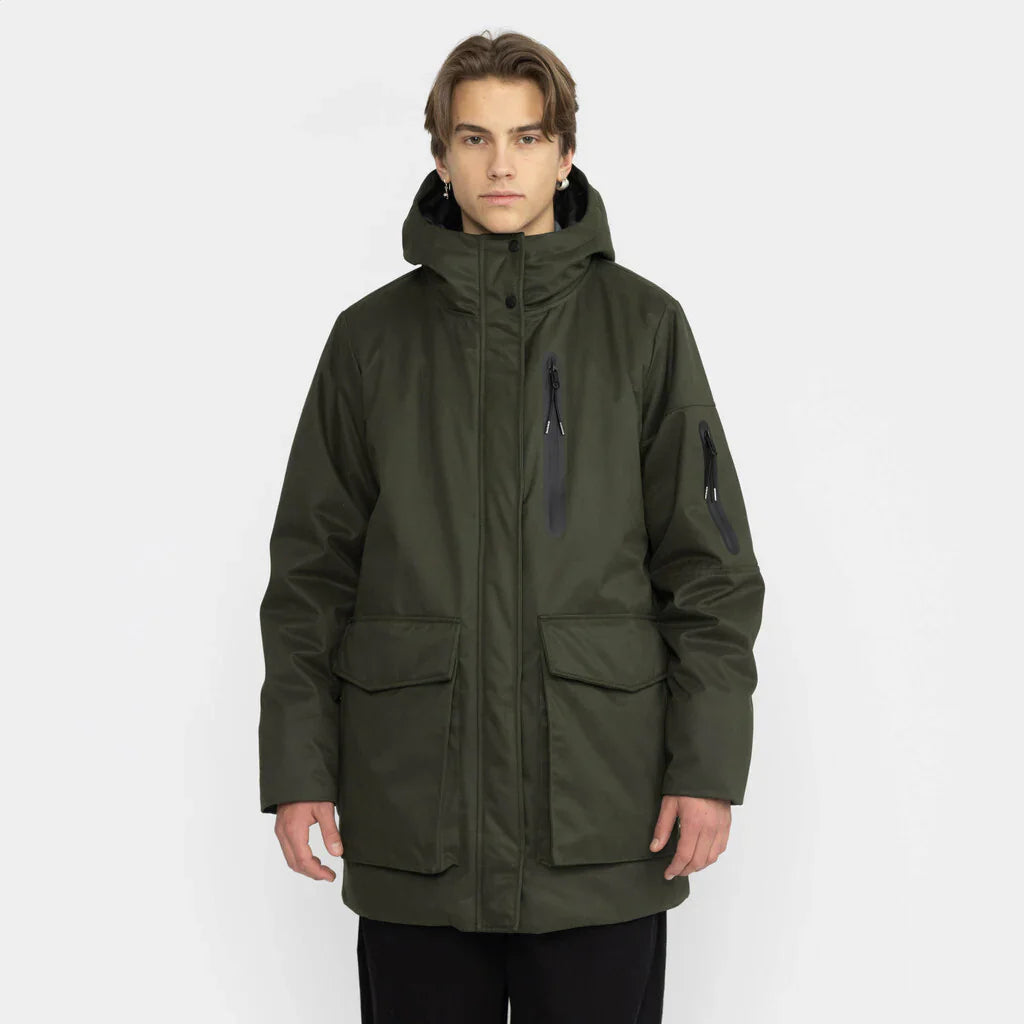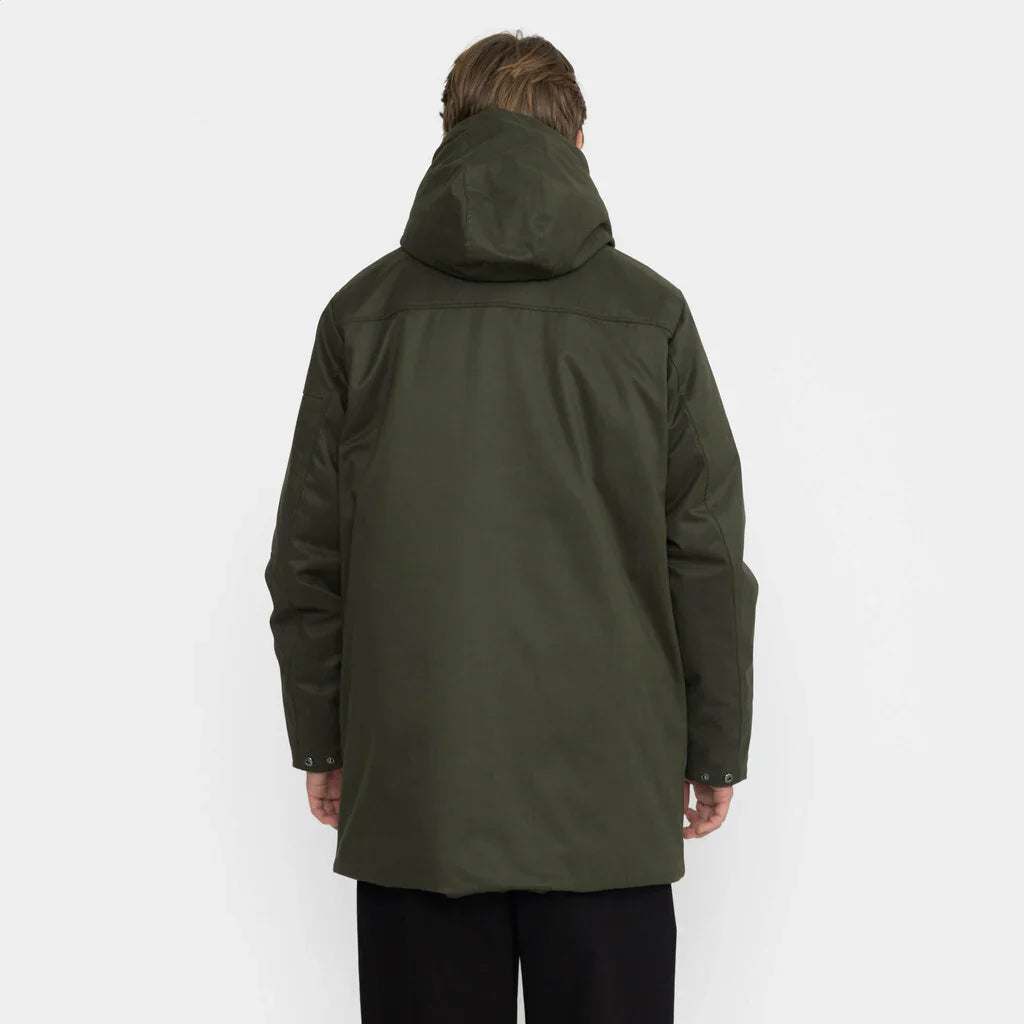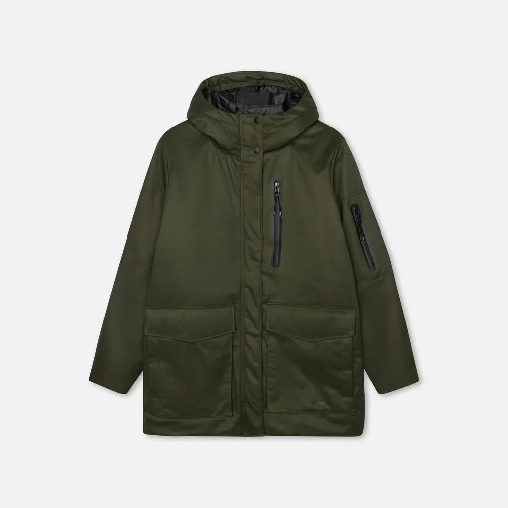 A mid-cut parka jacket made of a brushed cotton fabric with big pockets and black zippers. Has Teflon coating and Thinsulate pad.