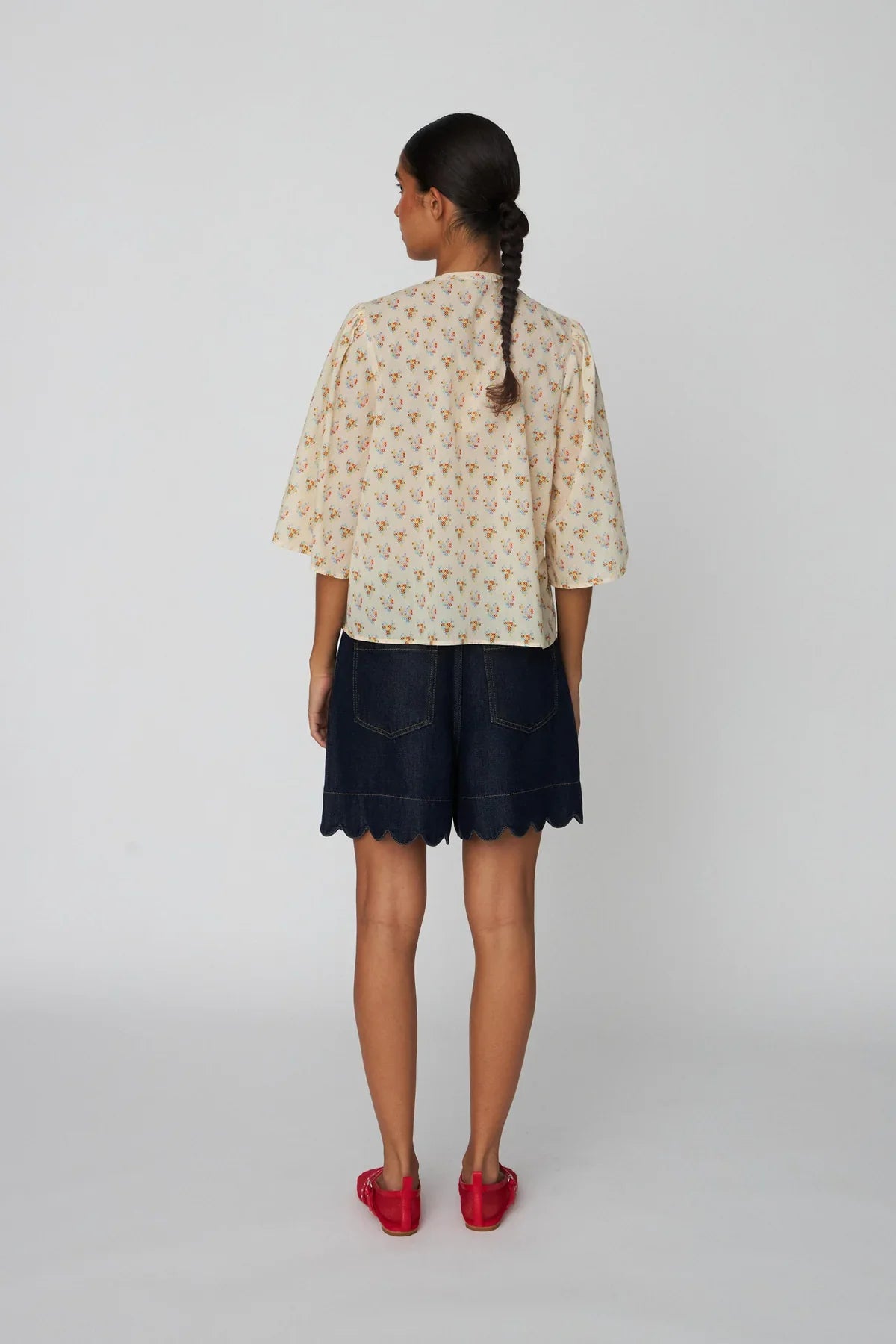 Blouse in a lightweight printed fabric featuring a round neckline, 3/4-length sleeves, and button closure. The blouse is slightly sheer. The model is 177 cm tall and wearing a size EU 36