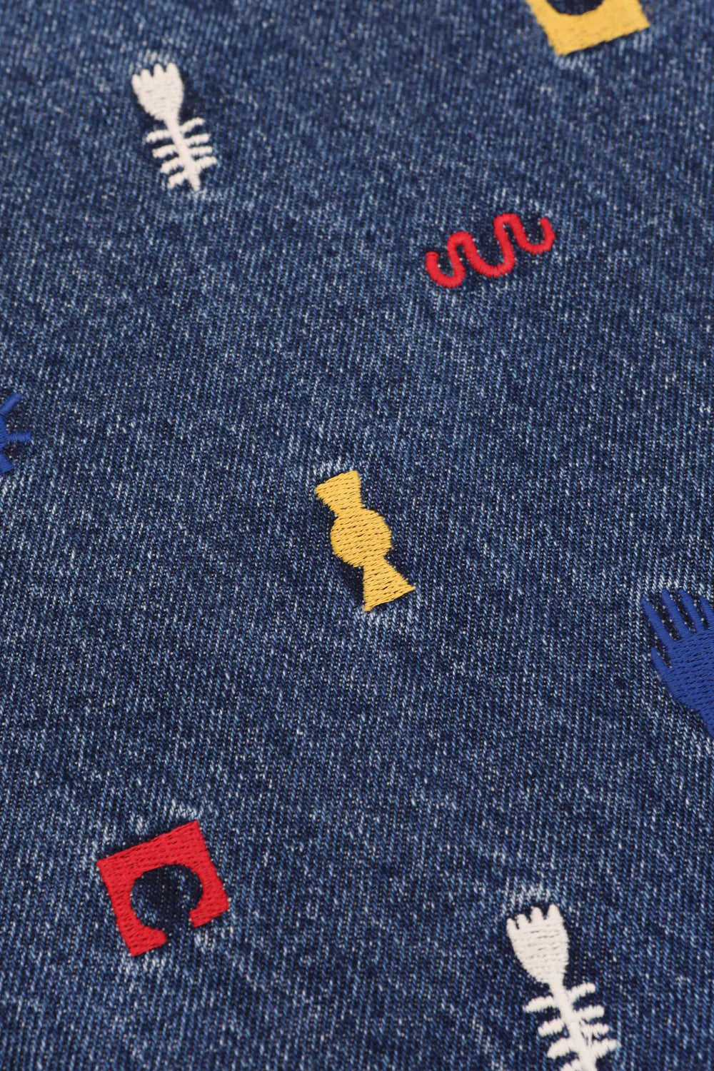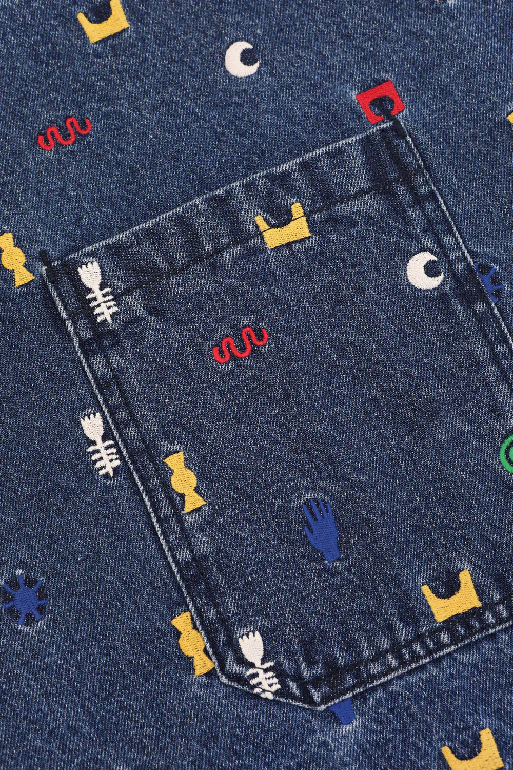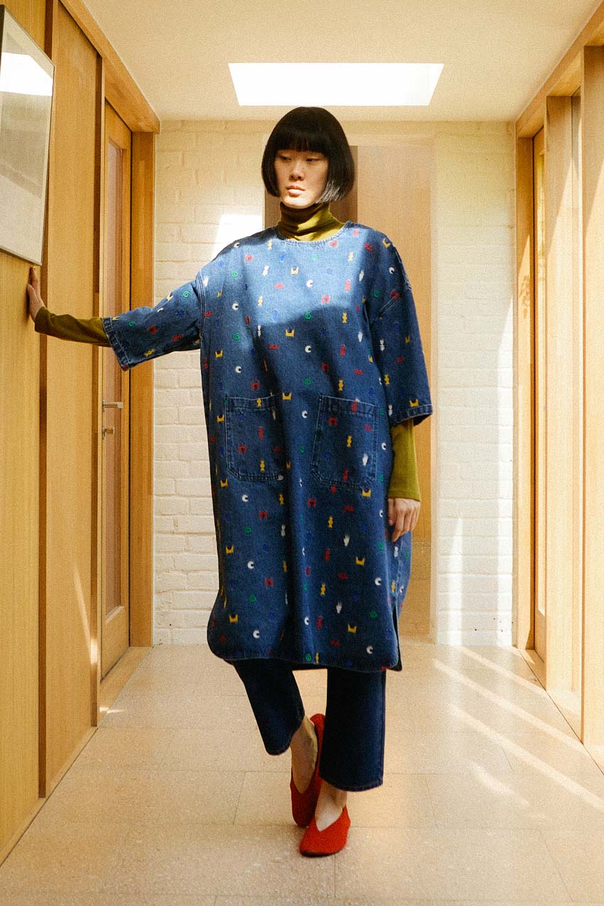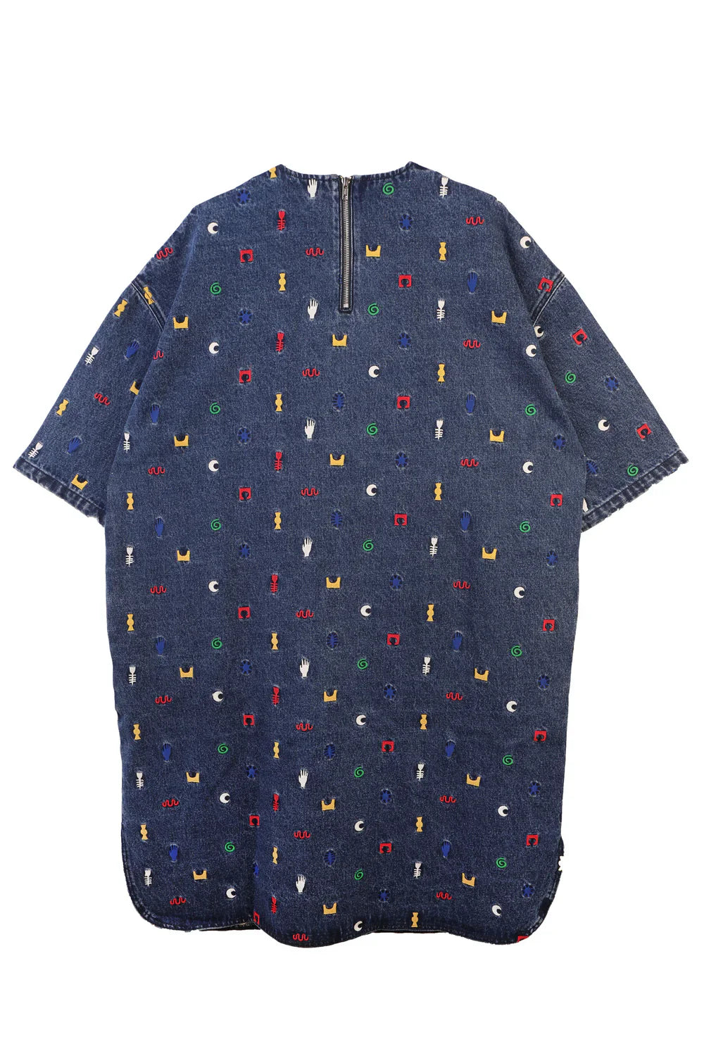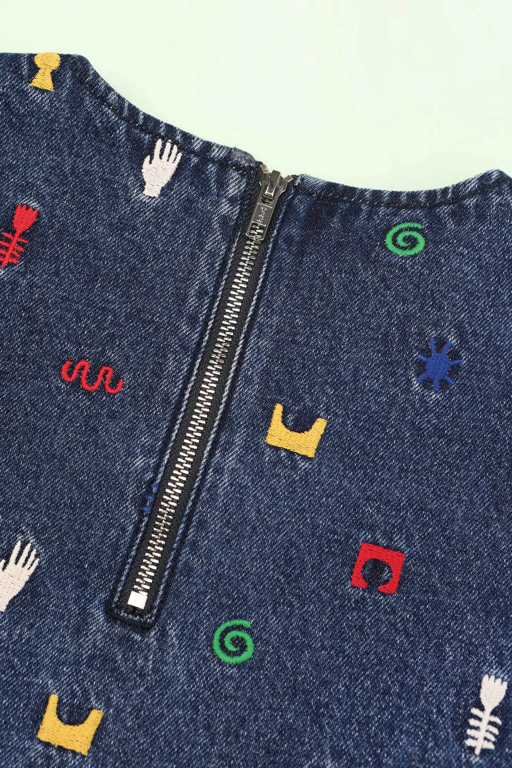 Miro Embroidered denim smock dress with a relaxed fit, midi length and 3/4 length sleeves. With a round neckline fastened with a zip at the back, side seam pockets and a curved side seam. Model is 5’11” / 180 cm and is wearing a size UK 8.