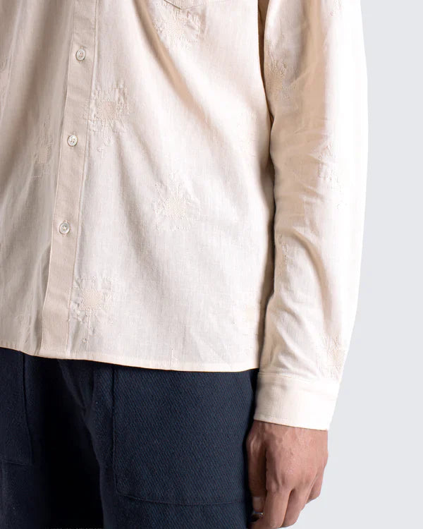 Made from a lightweight blend of cotton and hemp, this long sleeve shirt has a breathable, airy feel and a clean, boxy silhouette. Tonal, all-over embroidery lends subtle texture, with a Bauhaus-inspired abstract flower motif repeated across the body – carefully pattern-matched at the chest pocket and placket. Finished with a classic collar, locker loop, and 18L Mother-of-Pearl buttons.