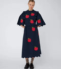 Midi dress with front button closure and ruffled round neckline. The dress features embroidered motifs and ruffles on the shoulders. The sleeves are three-quarter length with scalloped edges, and the skirt has a matching scalloped hem. Tie belt at the waist. The model is 174 cm tall and wearing a size EU 36