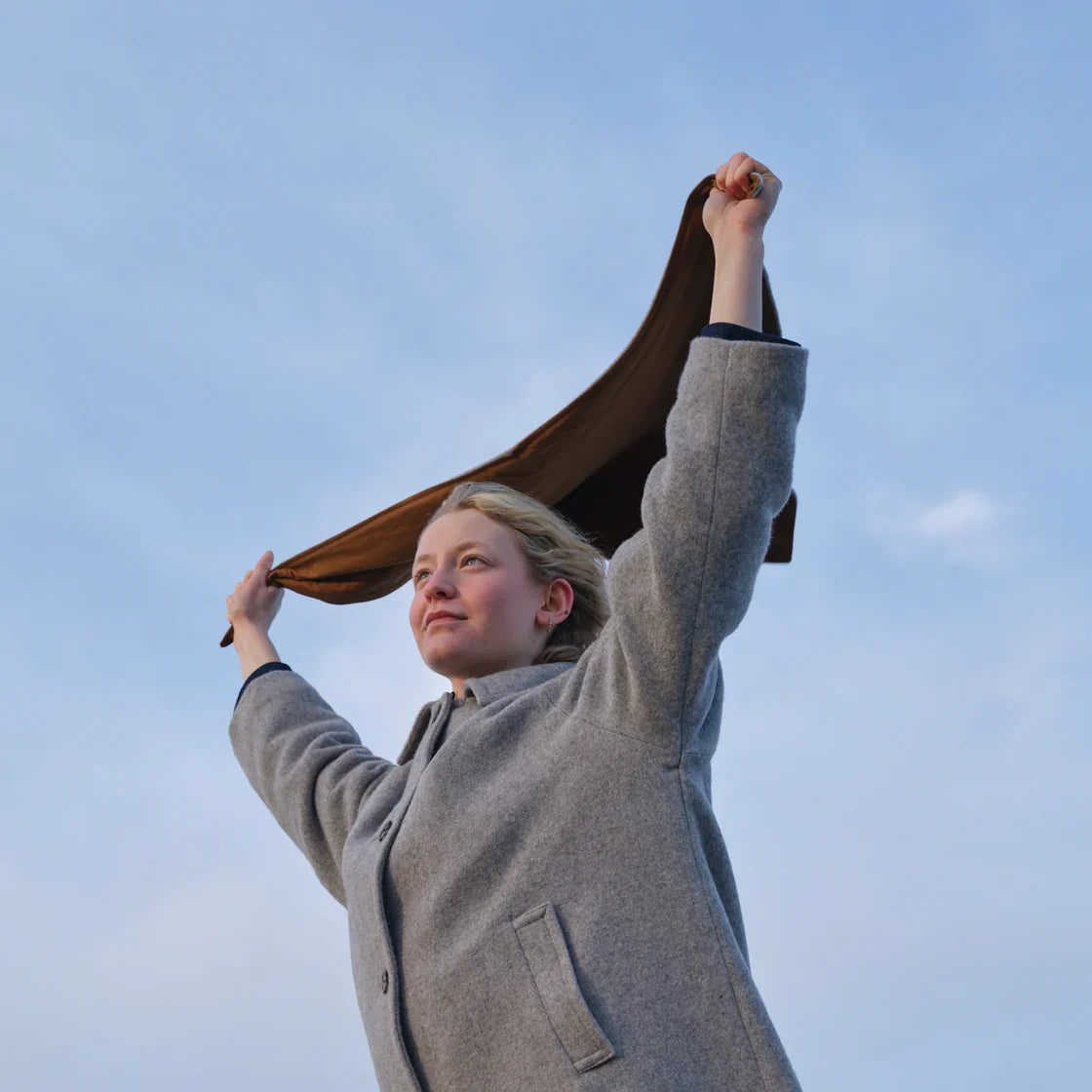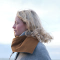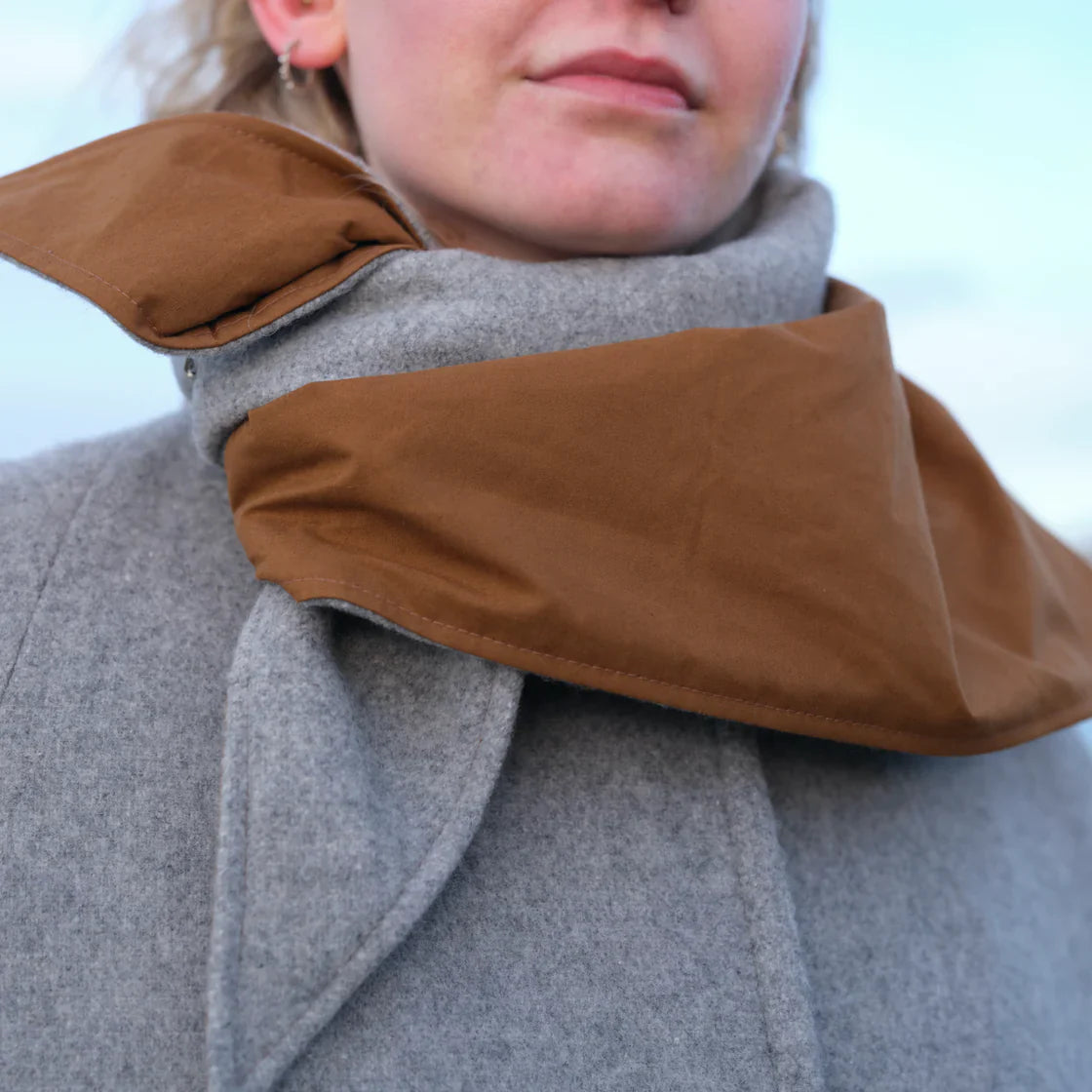 A triangle scarf made in contrasting colours and fabrics. The luxurious wool and wind/ water resistant wax cotton combo works superbly together to keep you warm.