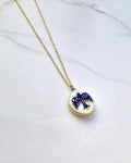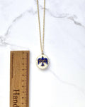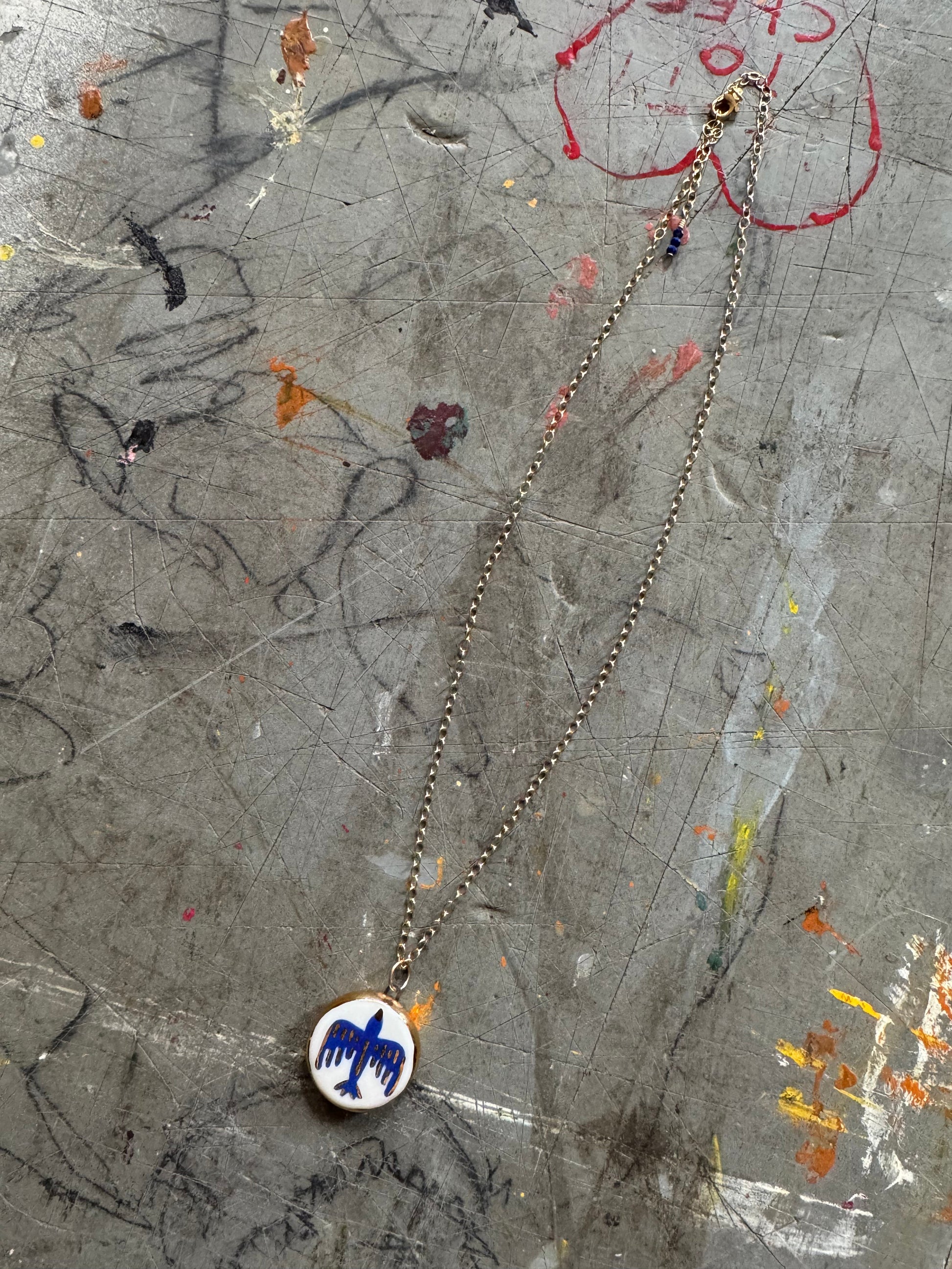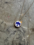 This hand painted motif necklace is a stunning piece to treasure. Made from fine white porcelain, the pendant has been decorated with underglaze before being kiln fired to a high-gloss transparent finish. The final decorations are 22ct gold lustre. Each one is unique and double sided.