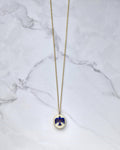 On an18" Gold Curb Chain, each finished with Lapis Lazuli beads at the end. These chains have a nice weight to them, being thicker than a standard chain. They can also be adjusted to suit your neckline. Lightweight at 8 grams Pendent measures approximately 30mm high 14ct filled gold chains 18" length