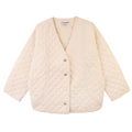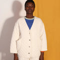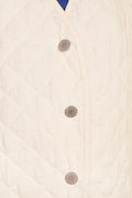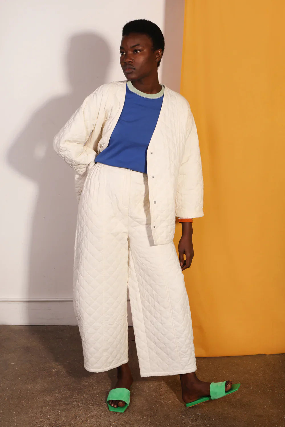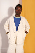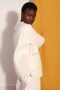 The Harlow Jacket has a relaxed fit with a low v-neckline fastened with matte silver snap buttons down the front. Made from an ecru padded cotton voile, featuring statement curved front pockets which continue on the back. Cotton voile. Padded jacket.