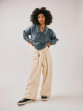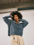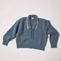 A relaxed looking sweater with a collared V neck with crocheted edge. Ties adorn the front collar allowing for styling as a bow or as dangling ties. This sweater is extremely soft, and would make for a great all year round style. Maya is 5'7" and wears a size S/M