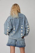 Denim jacket with lace-up details along the sides and sleeves. The jacket has a relaxed fit, chest flap pockets, and closes with buttons at the front. It features a classic collar and 7/8 sleeves. The model is 173 cm tall and is wearing size S/M
