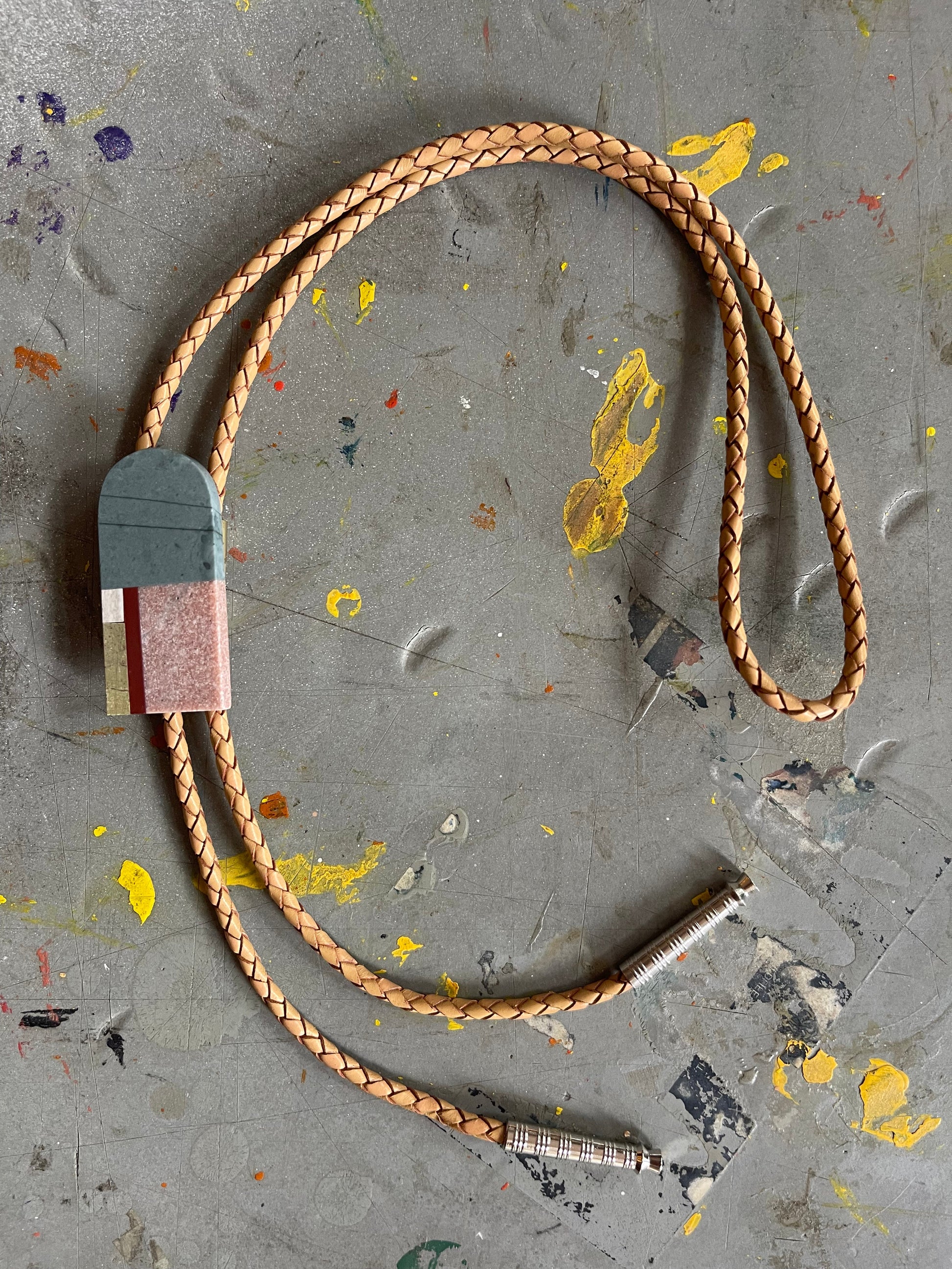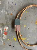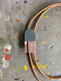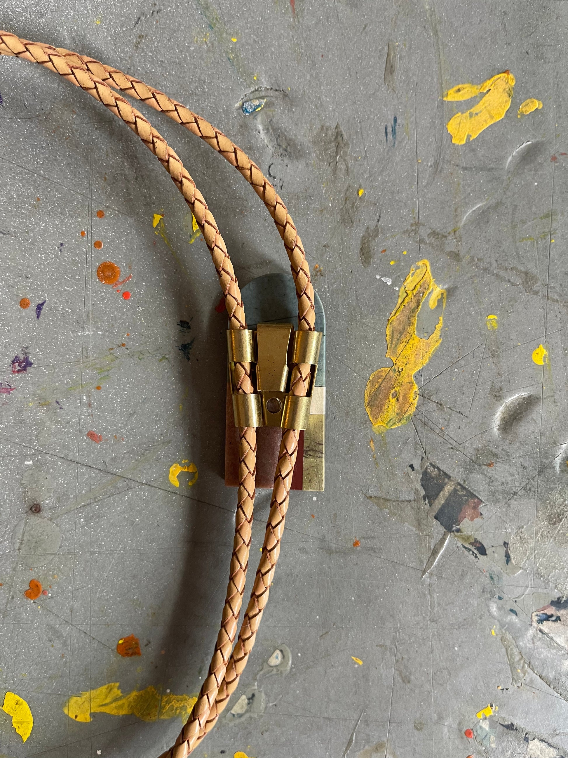 The bolo piece is 48mm wide and 55mm tall with a brass backing. The genuine leather cord is 33" long with brass tips.