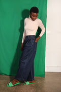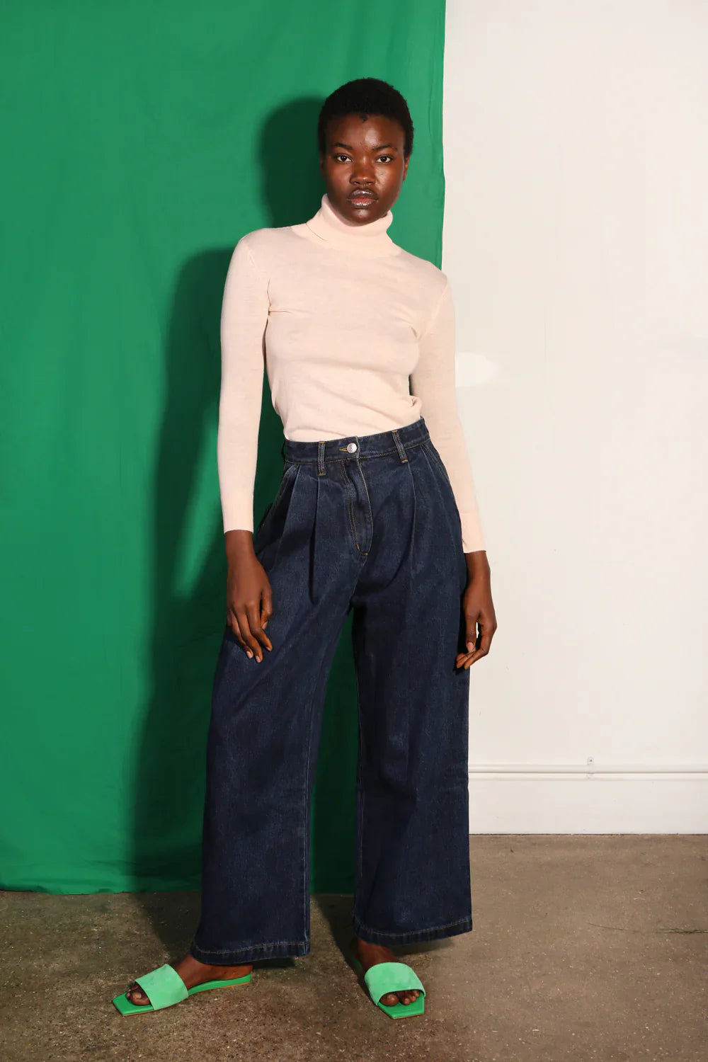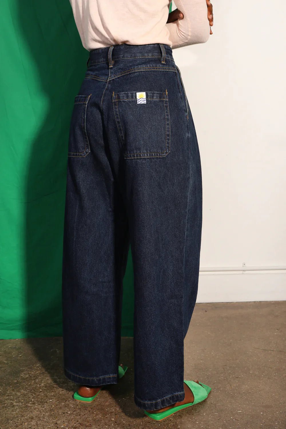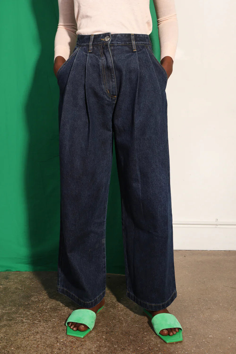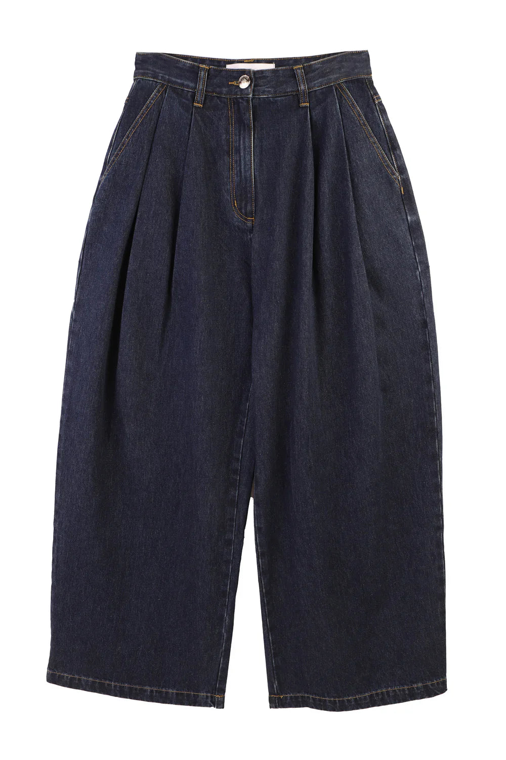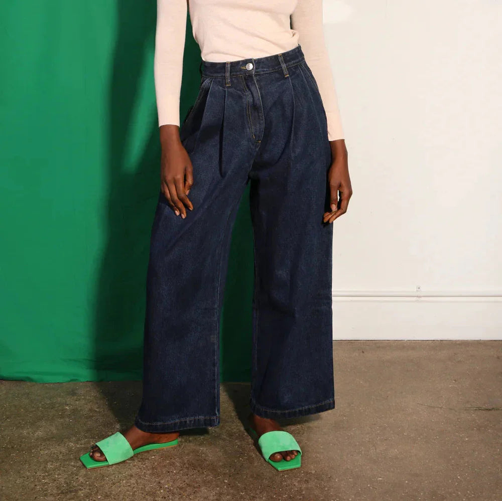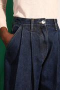 High-waisted pleat front jeans in robust, heavyweight indigo denim. Features utility pocket detailing and contrast ochre topstitching.