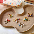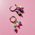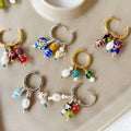 Zero waste jewellery. Colour pop bead earrings on huggie hoops. Crafted from Millefiori pressed glass beads and freshwater Pearls. Mix and match, in line with the no waste ethos, and therefore not exactly the same, but they will be similar to those shown in the images. There are a mix of pearls, hearts and round beads in fun colour poppin' shades of red, green, blue, white, yellow, black and clear