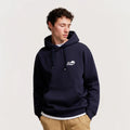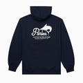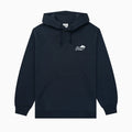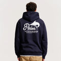 The Marlin Hood in Midnight. A soft, brushed-back hoodie made from an organic cotton and recycled poly blend. Featuring a classic pouch pocket, adjustable drawstring hood and ribbed hems. Detailed with a large, printed design on the back and a smaller printed logo on the chest.