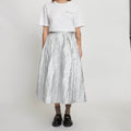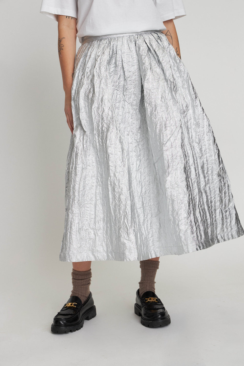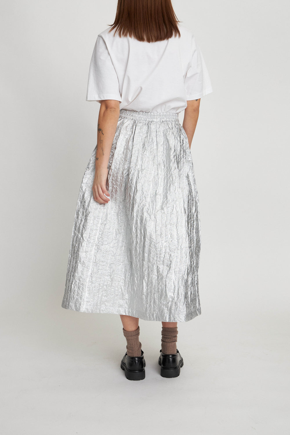 Voluminous midi skirt in a crisp silver material. The skirt has hidden side pockets and a half elastic waistband. A very powerful item that elevates every outfit.