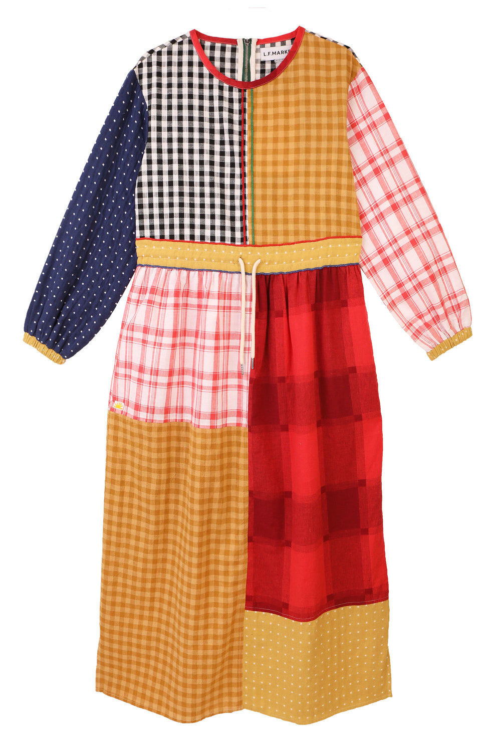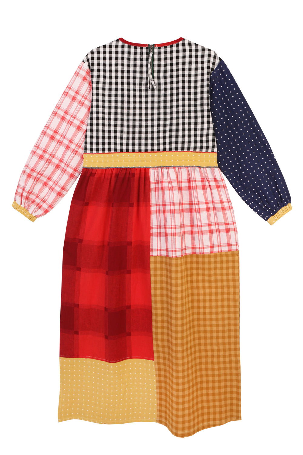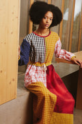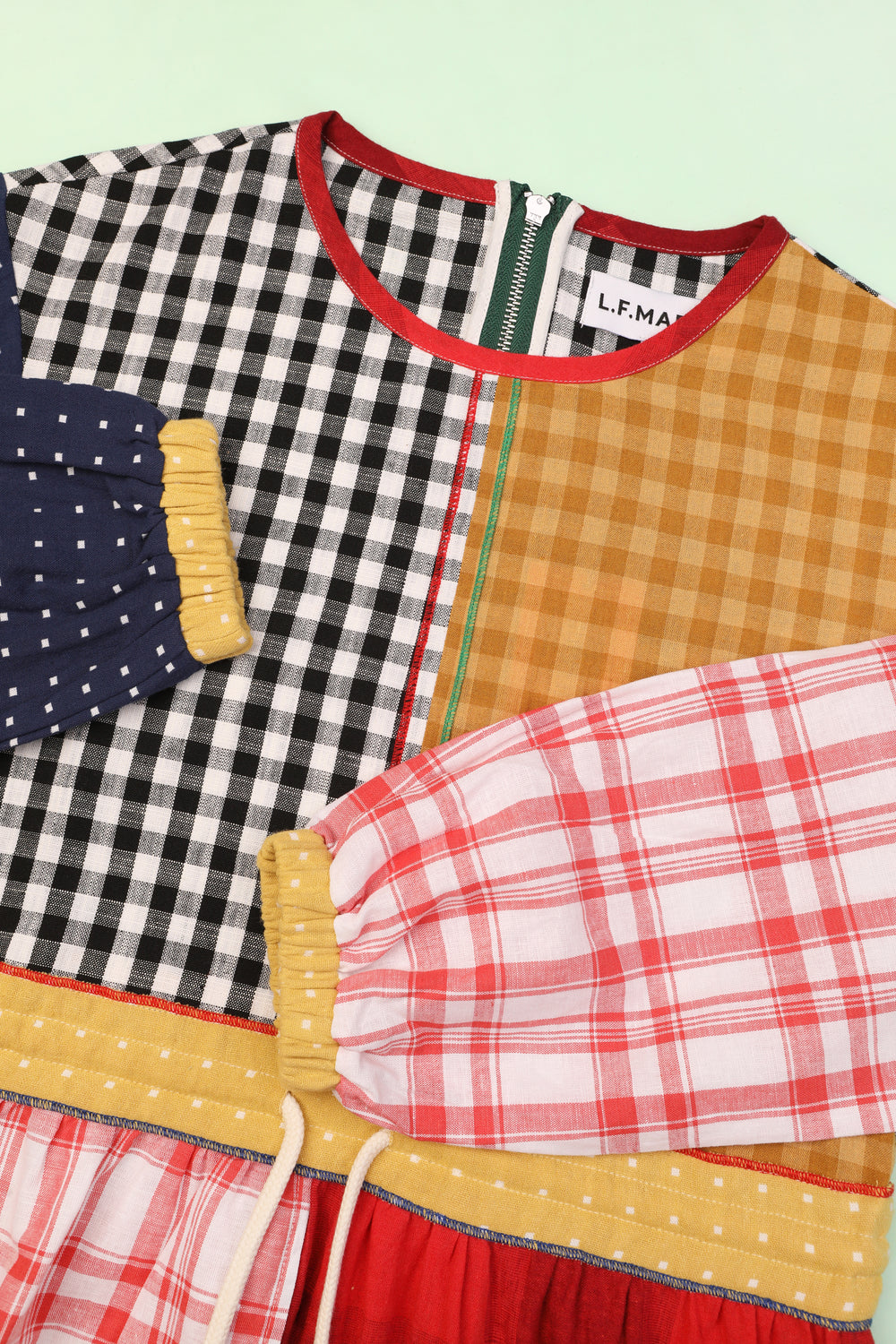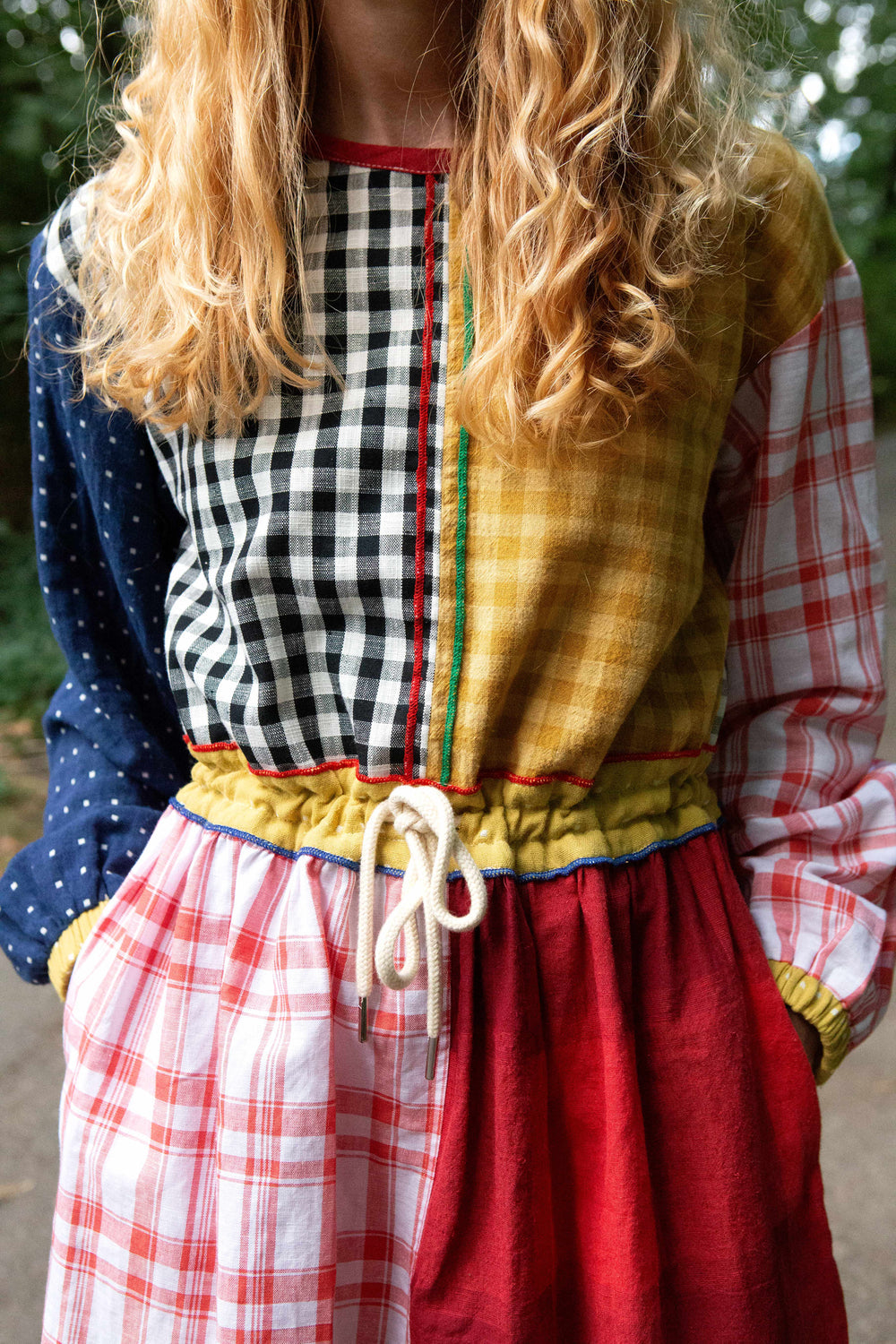The Slade Dres is a midi length, longsleeved dress with a round neckline fastened with a contrasting zip at the back. It features an adjustable waistline fastened with a drawstring rope tie, side seam pockets and side splits. Crafted from a playful patchwork of various textural check and gingham fabrics, with contrasting primary coloured babylock stitching on the front seams and waistband.