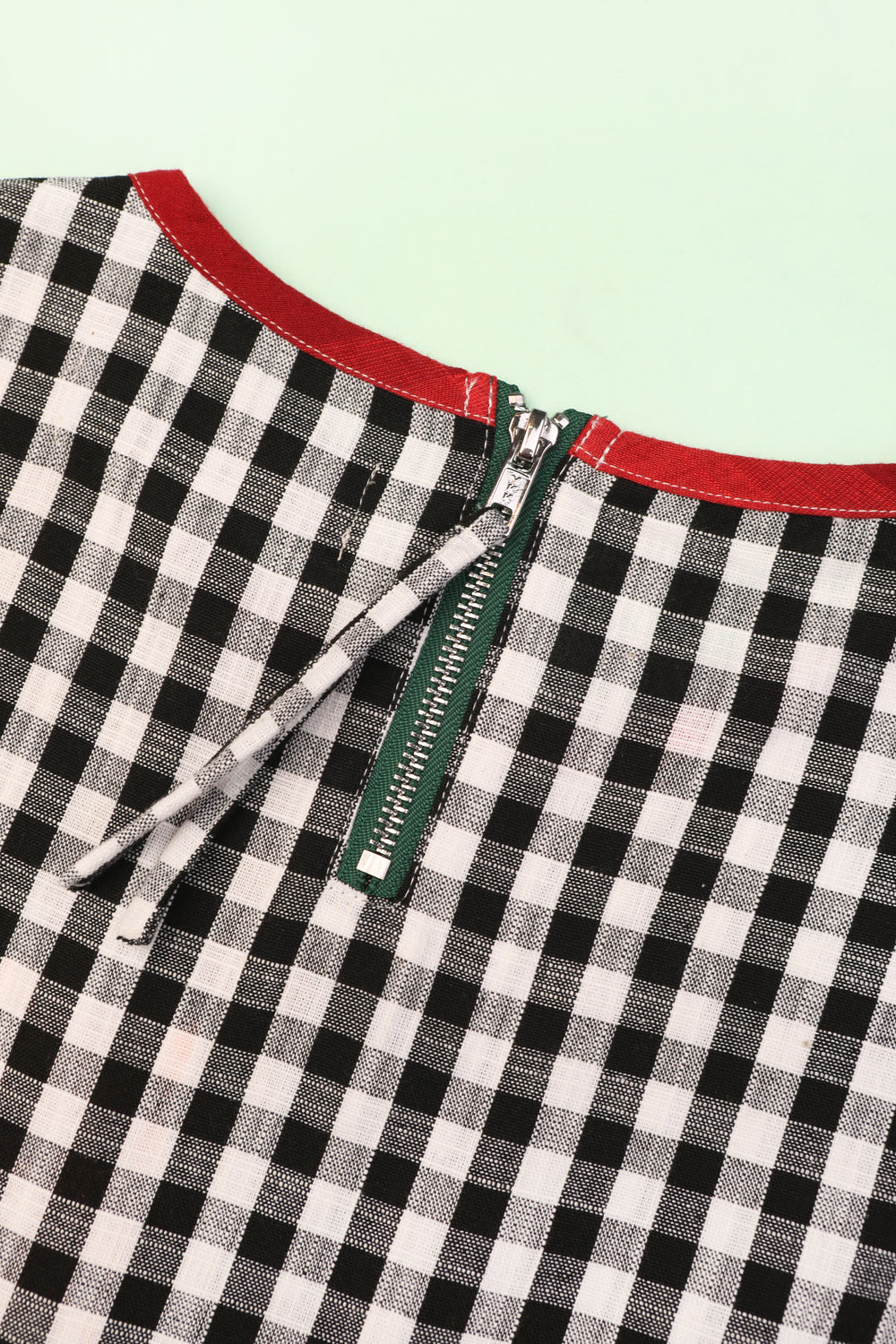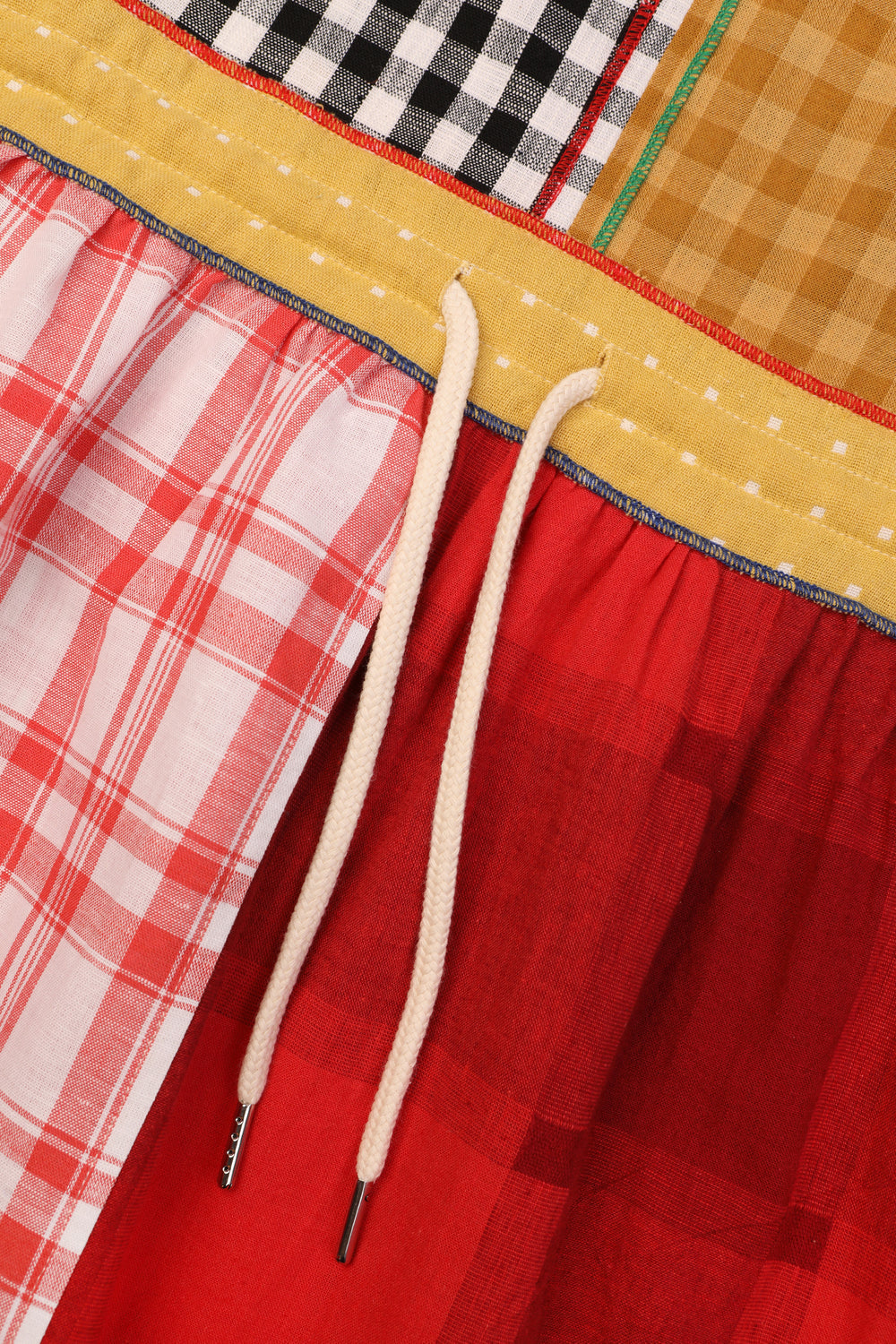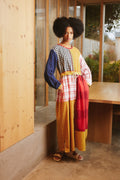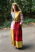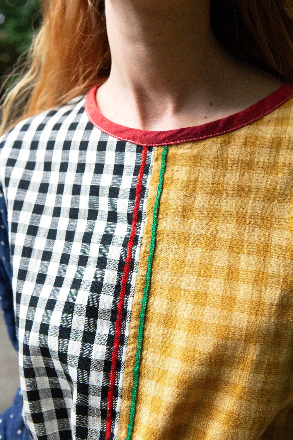 The Slade Dres is a midi length, longsleeved dress with a round neckline fastened with a contrasting zip at the back. It features an adjustable waistline fastened with a drawstring rope tie, side seam pockets and side splits. Crafted from a playful patchwork of various textural check and gingham fabrics, with contrasting primary coloured babylock stitching on the front seams and waistband.