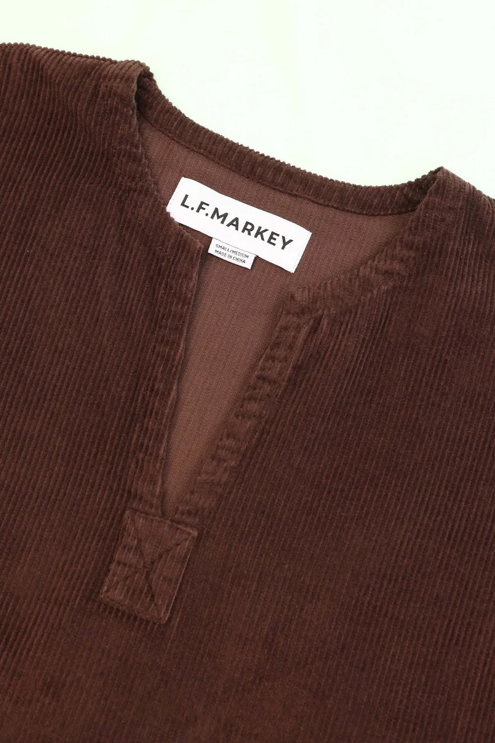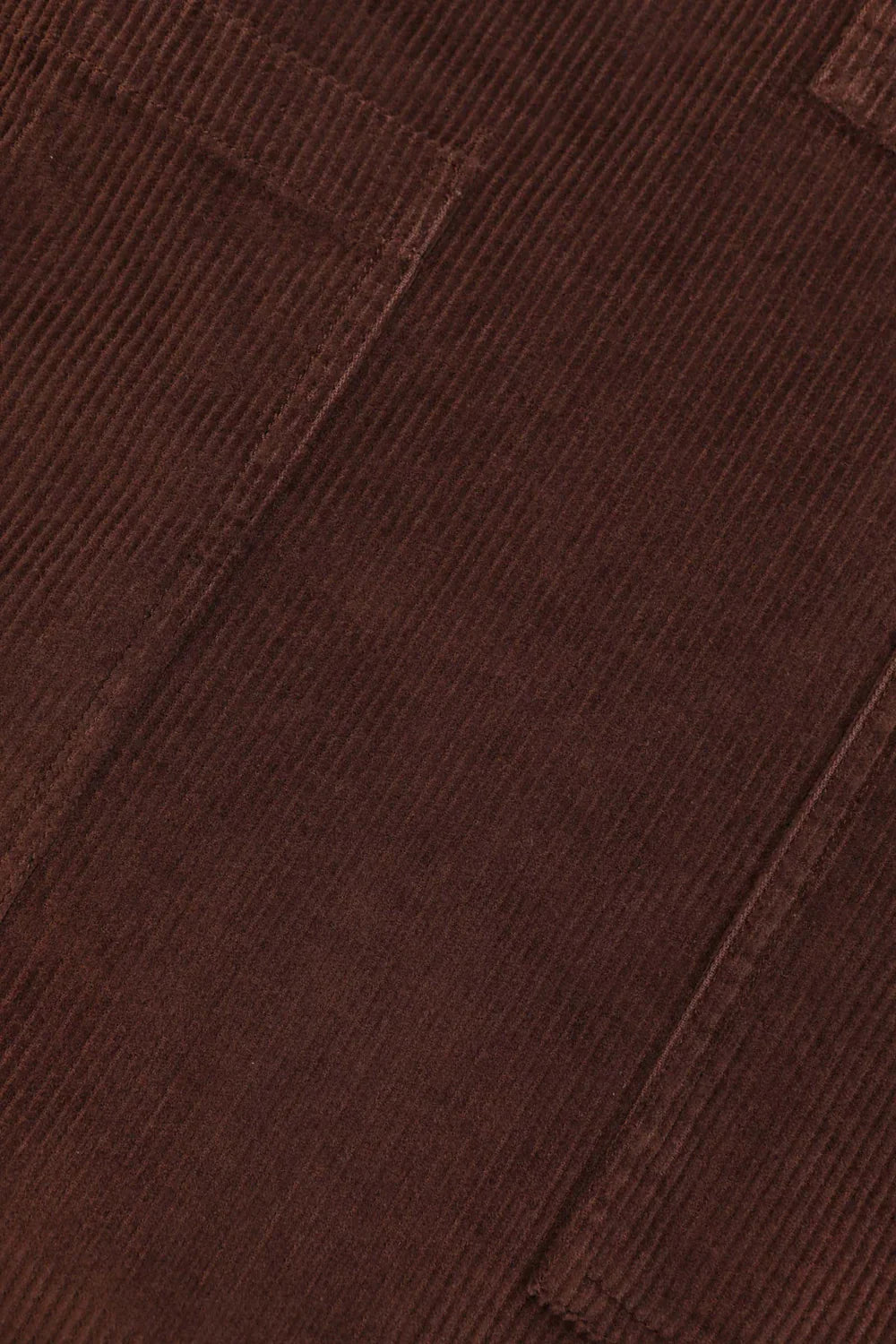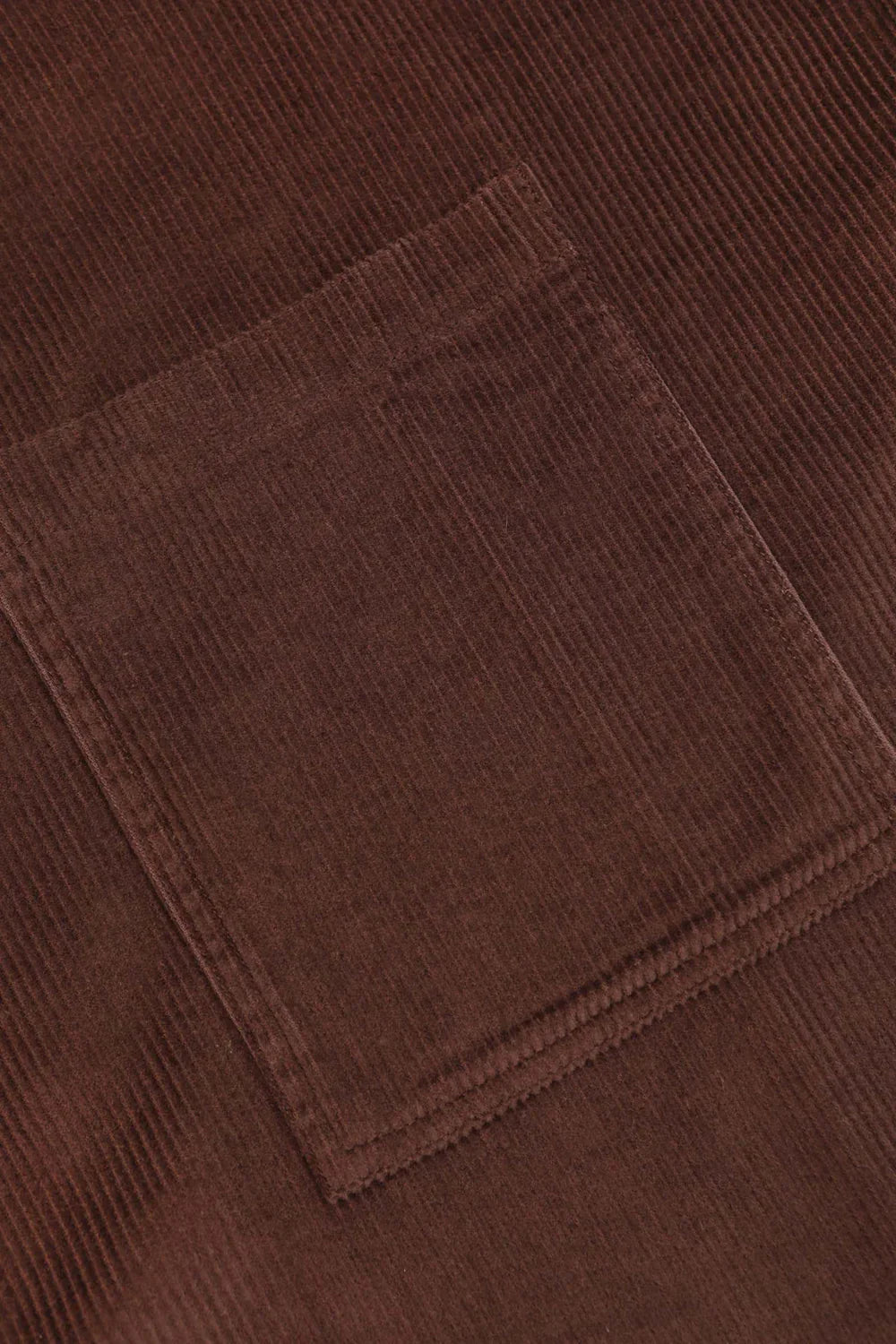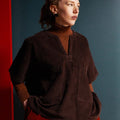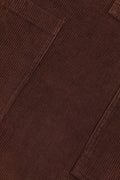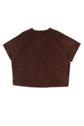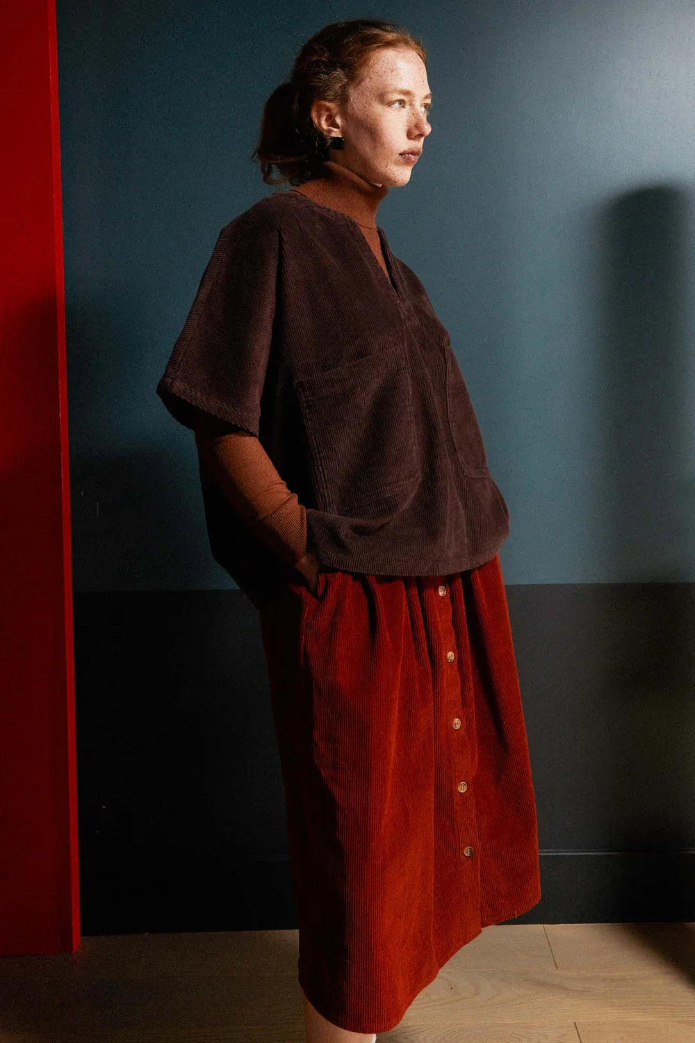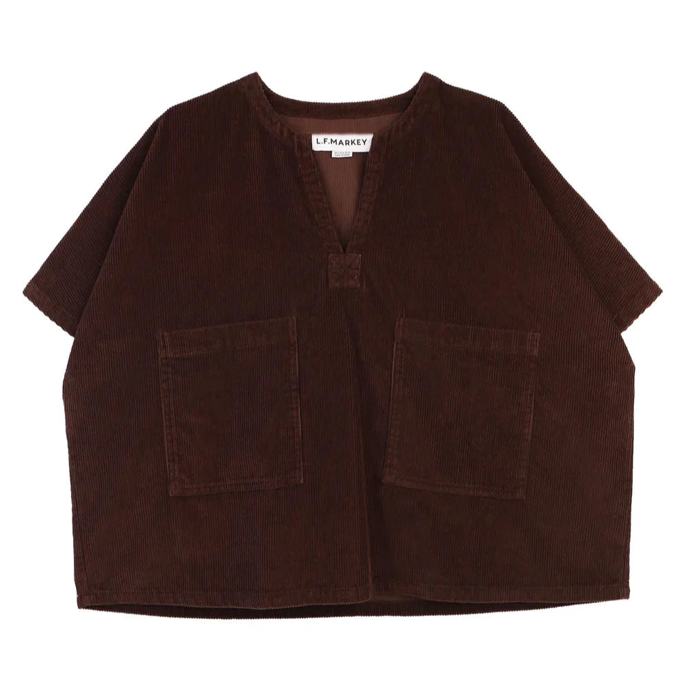The Trevor Top is a wide-fit, boxy square shape top with a slight crop and short sleeves. Featuring a low v-neckline and front patch pockets. Made from a deep umber brown cotton corduroy. Model is 5'9" / 176 cm and is wearing a size SM.