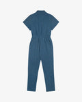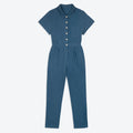 The tried and tested classic short sleeved summer boilersuit is back in a washed blue. This jumpsuit is a relaxed style, with front button opening to the zip and a three quarter elastic waist with front pleats for a flattering fit. The eco friendly corozo nut buttons are made in the Cotswolds in a small factory dedicated to bringing back UK button making. Patch pocket at the top and roomy side pockets in the trousers. These overalls are the perfect summer staple for your wardrobe.