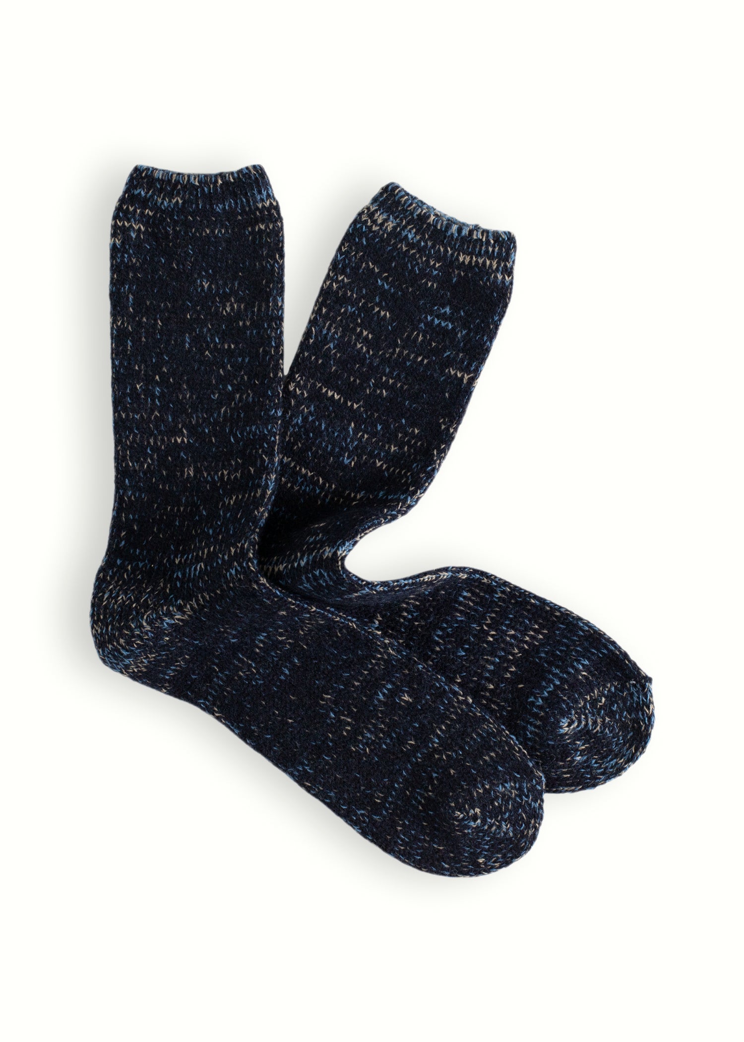 These Wool Collection Recycled Navy socks are knitted in navy recycled wool on the outside, which have thinner white and blue yarns inside that reveal a beautiful effect on the outside.
