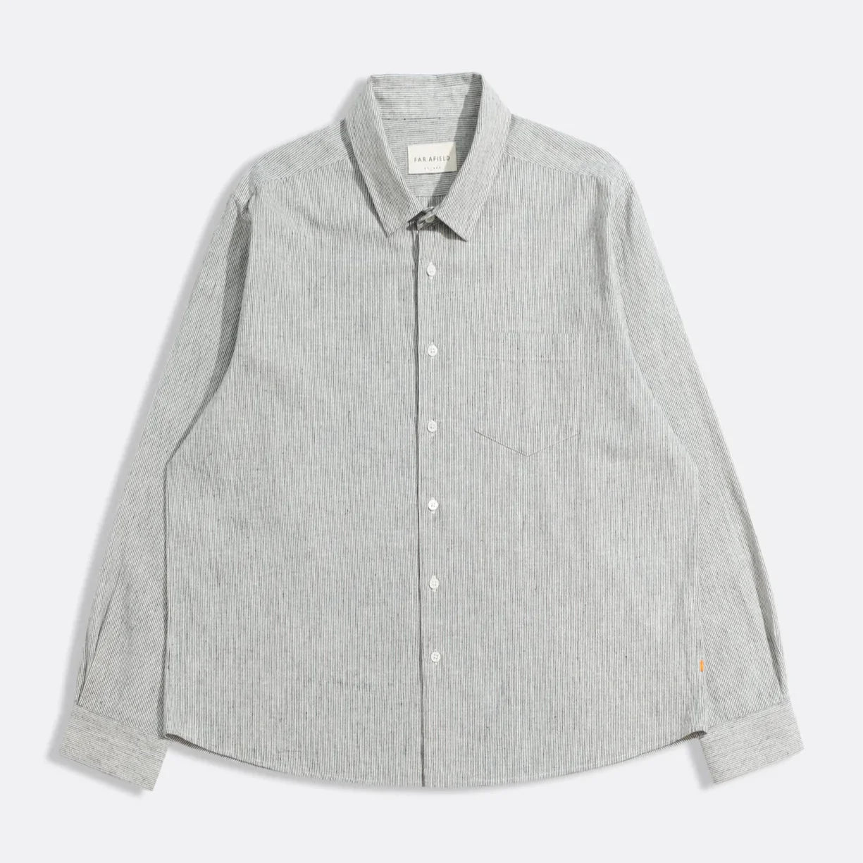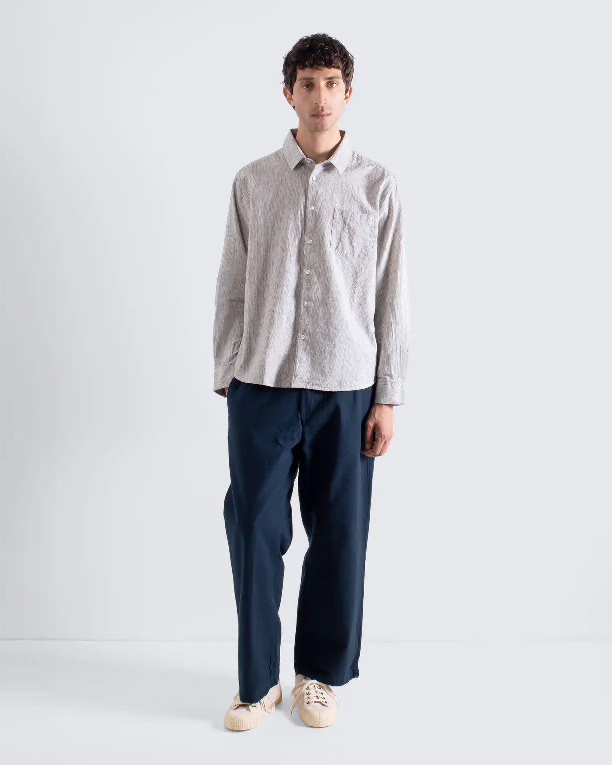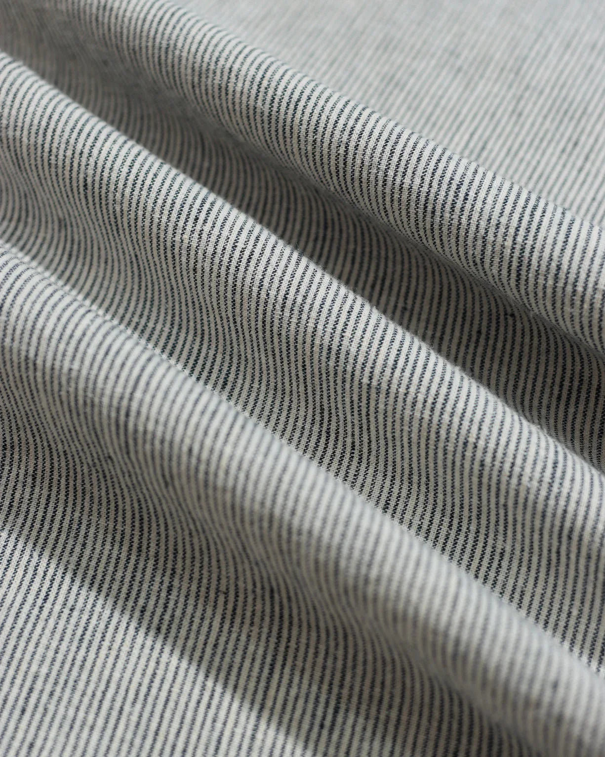 The Day Shirt is cut with a wide, relaxed silhouette and a hem that curves and drops at the back, giving it an easy sense of movement. The cloth is a yarn-dyed cotton-linen blend we’ve been waiting to use, woven with fine stripes that carry subtle slubs and texture, bringing depth and a lived-in feel from day one. Finished with natural mother-of-pearl buttons that catch the light against the textured fabric.